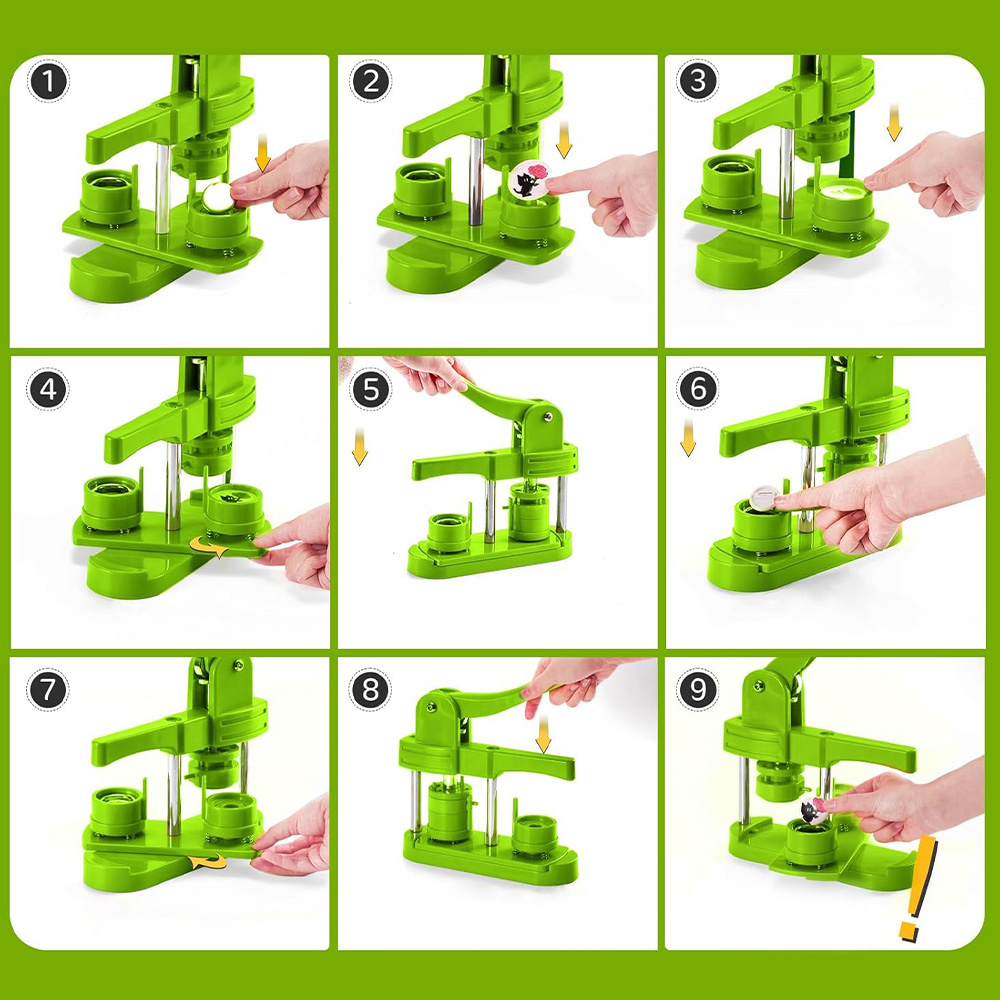 Спочатку виріжте зображення нашим вільним ножем для різання кіл. Потім покладіть кришку металевої таблички у верхній формі і покладіть зображення на обкладинку. Потім помістіть прозору фольгу на зображення і натисніть важіль для машинної машини. Нарешті, покладіть металеве дно на дно форми і знову натисніть важіль. Таким чином ви отримаєте власну табличку з кнопки.