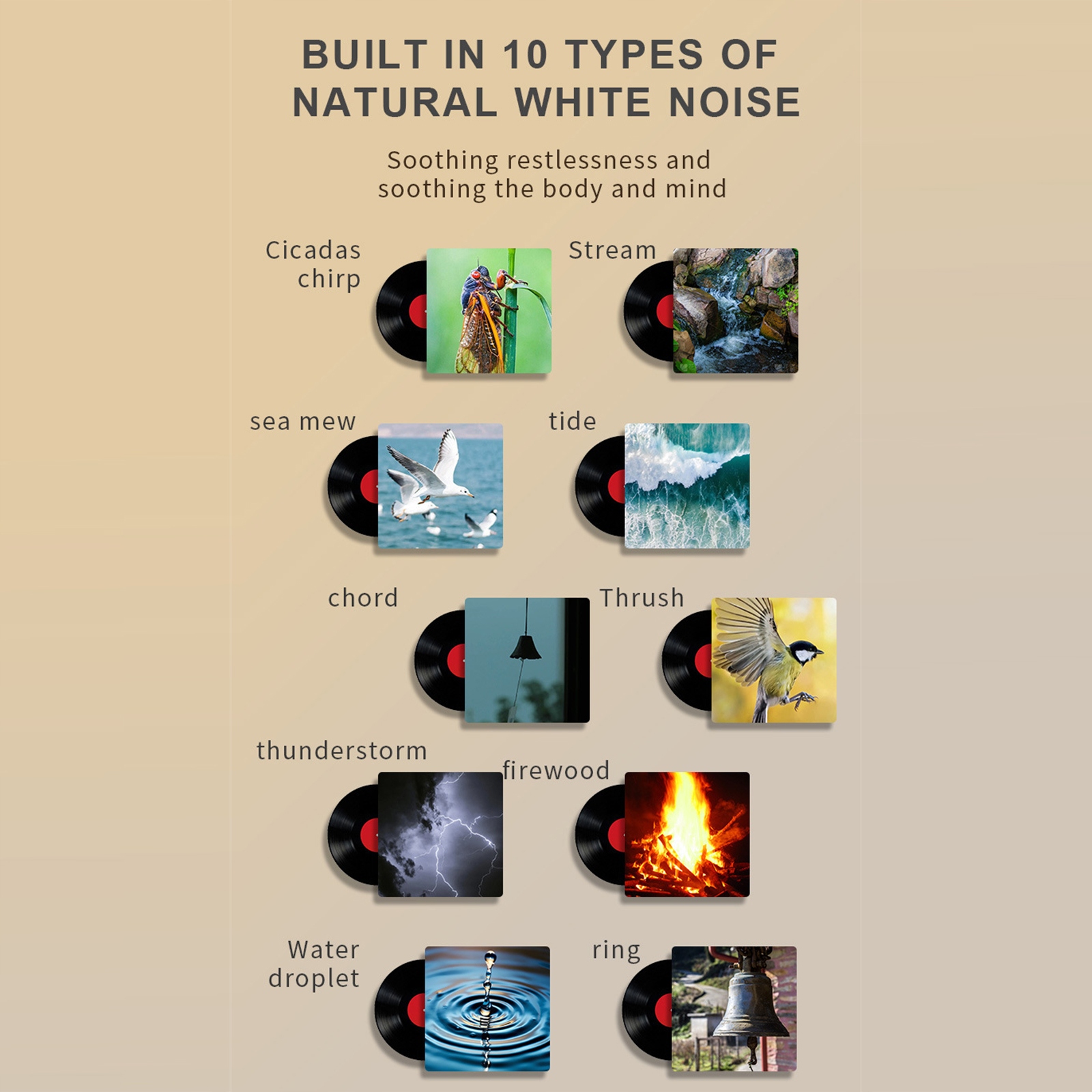 1. Дизайн білого шуму: цей інструмент для сну має вбудований білий шум і природні звуки (наприклад, хвилі, вітер, дощ тощо), які можуть ефективно блокувати шум навколишнього середовища, створювати тихе та комфортне середовище для сну та допомагати користувачам швидше заснути.