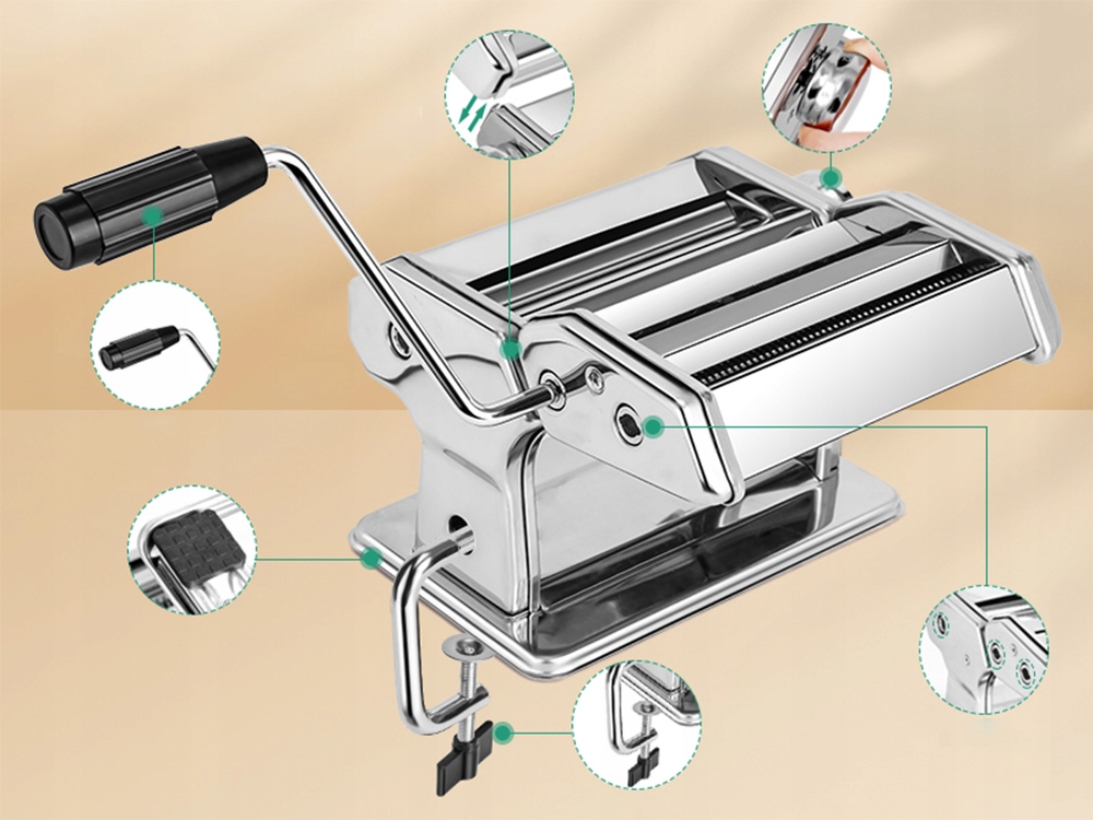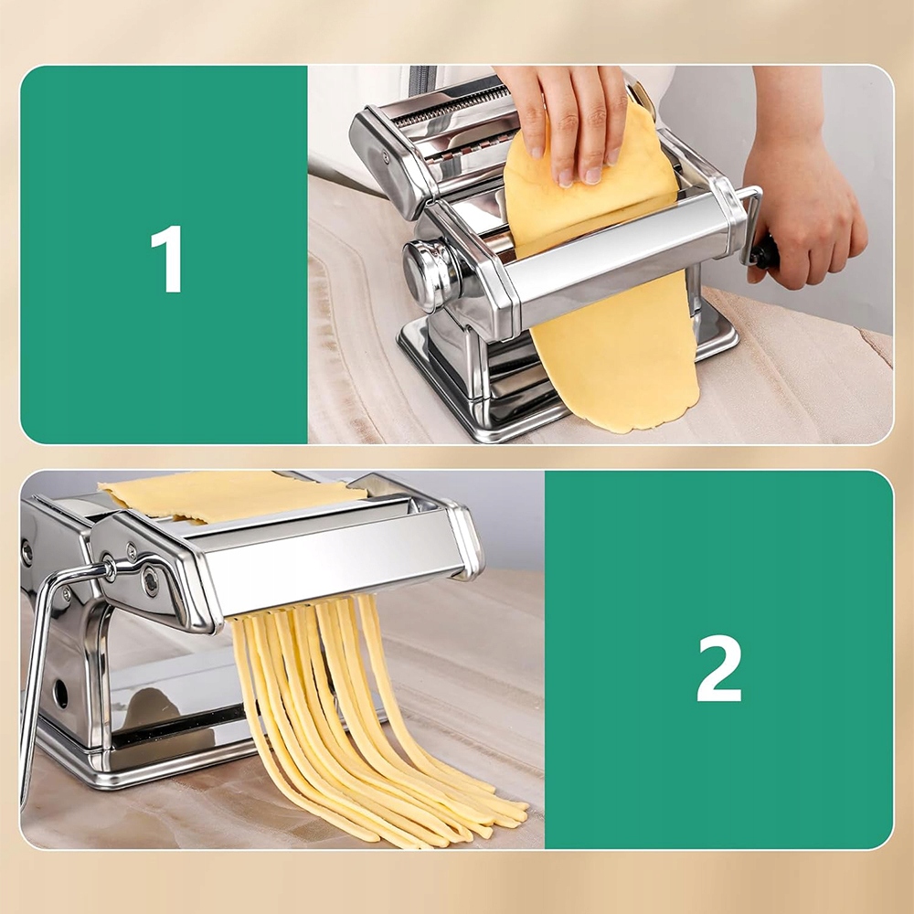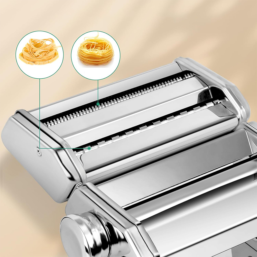 - Оснащений роликом, ножем і тортом, він ідеально підходить для виготовлення макаронних виробів, феттукцину, лазаньї тощо. У ручку регулювання товщина має 7 рівнів регулювання, від 0,5 мм до 3 мм, що зручно використовувати два кріплення для різання, а за допомогою макаронних виробів ви можете вибрати ширину від 6,5 мм до 1,5 мм.