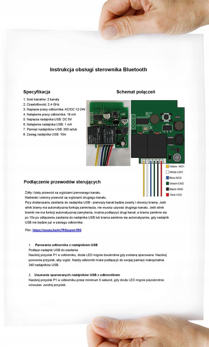 When the car with USB plug inserted into the USB charging port (USB зарядні пристрої) - Ворота відкриваються автоматично з відстані близько 10 метрів. Після виявлення сигналу приймач піднімає перше реле, і після втрати сигналу перераховано друге реле. Час короткого замикання: 1 секунда. 4