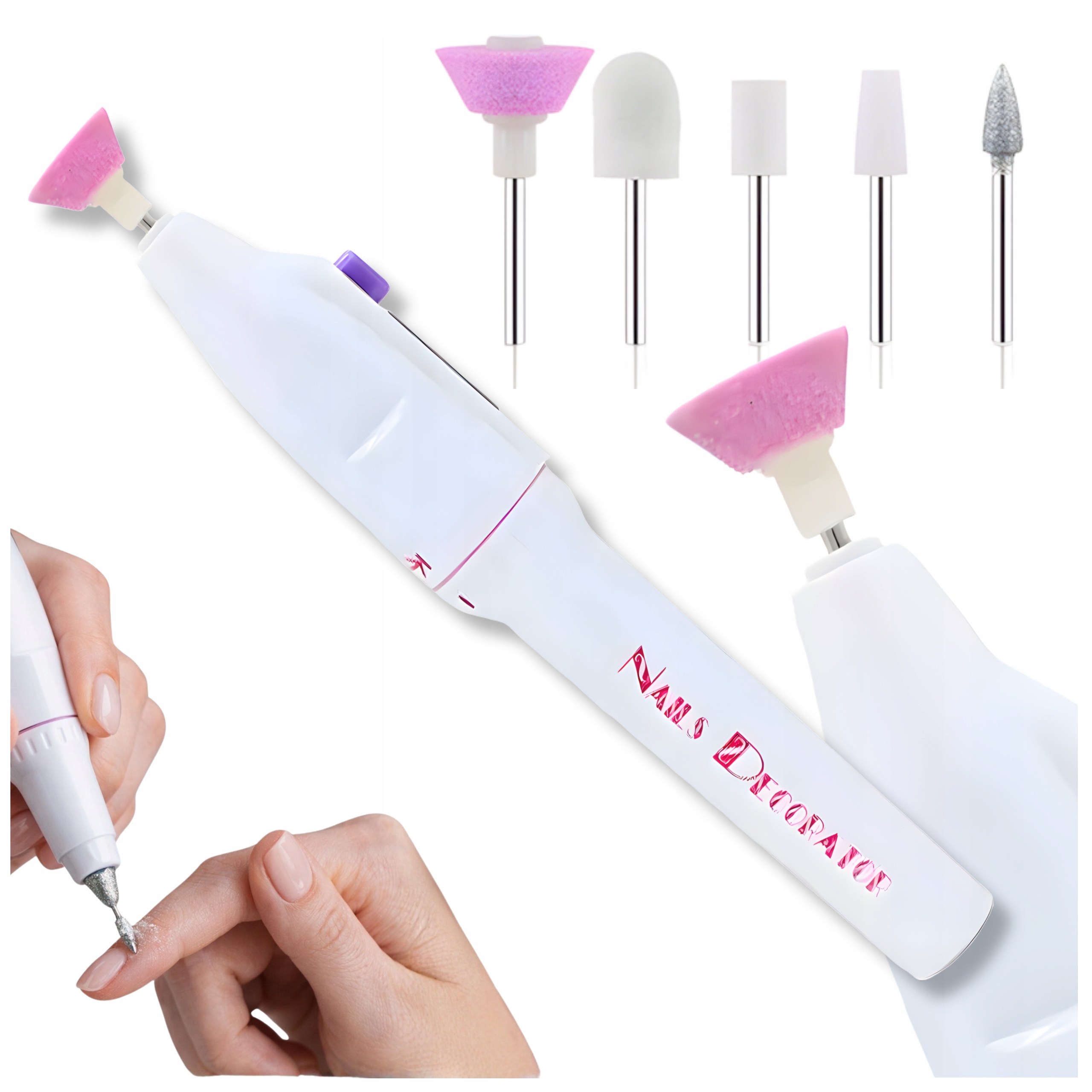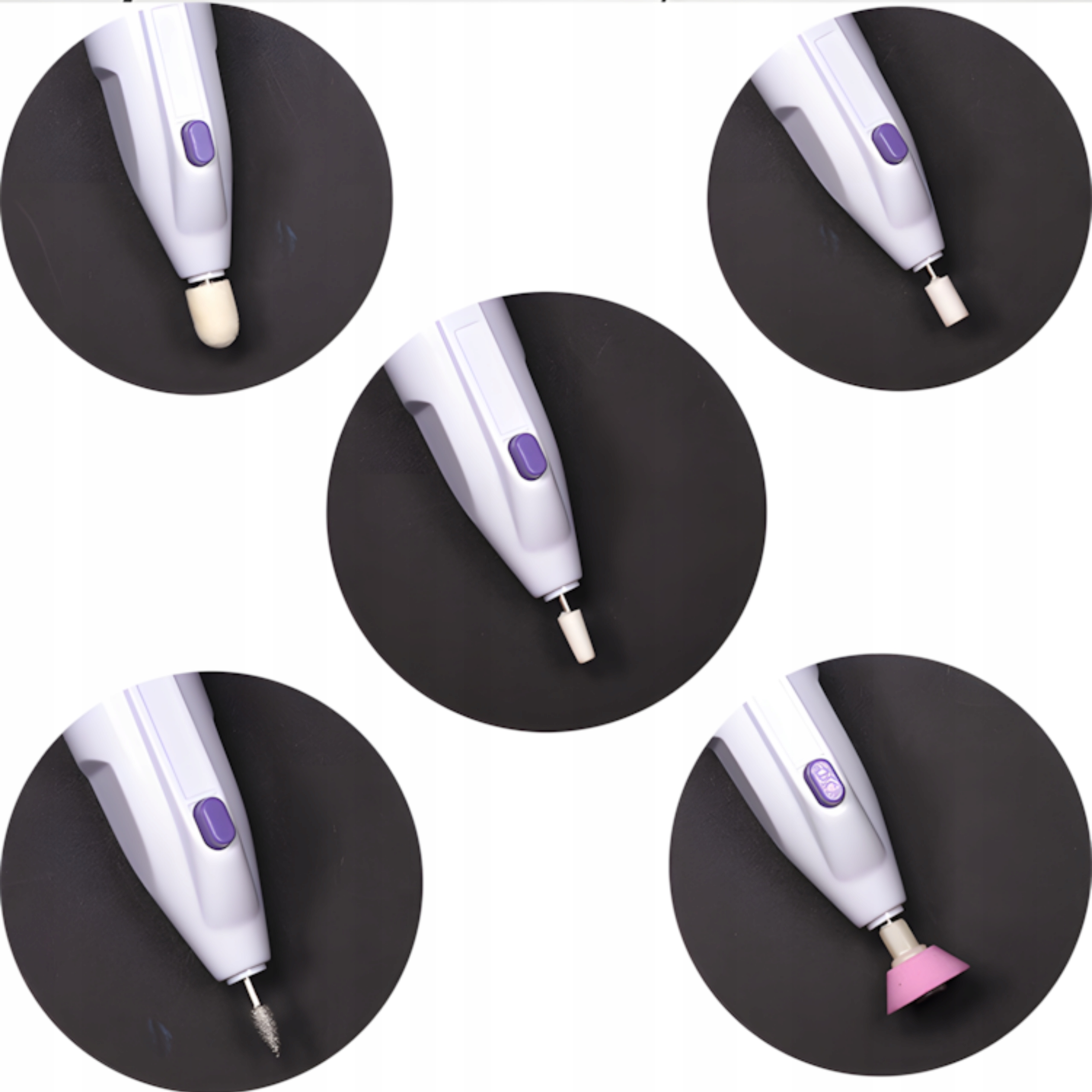 Набір із п'яти фрез дозволяє вирівняти нігтьову пластину, видалити кутикулу, матувати кінчики нігтів, відполірувати поверхню нігтя та зробити делікатний декор. Кожен наконечник має різну функцію, що збільшує універсальність пристрою.
