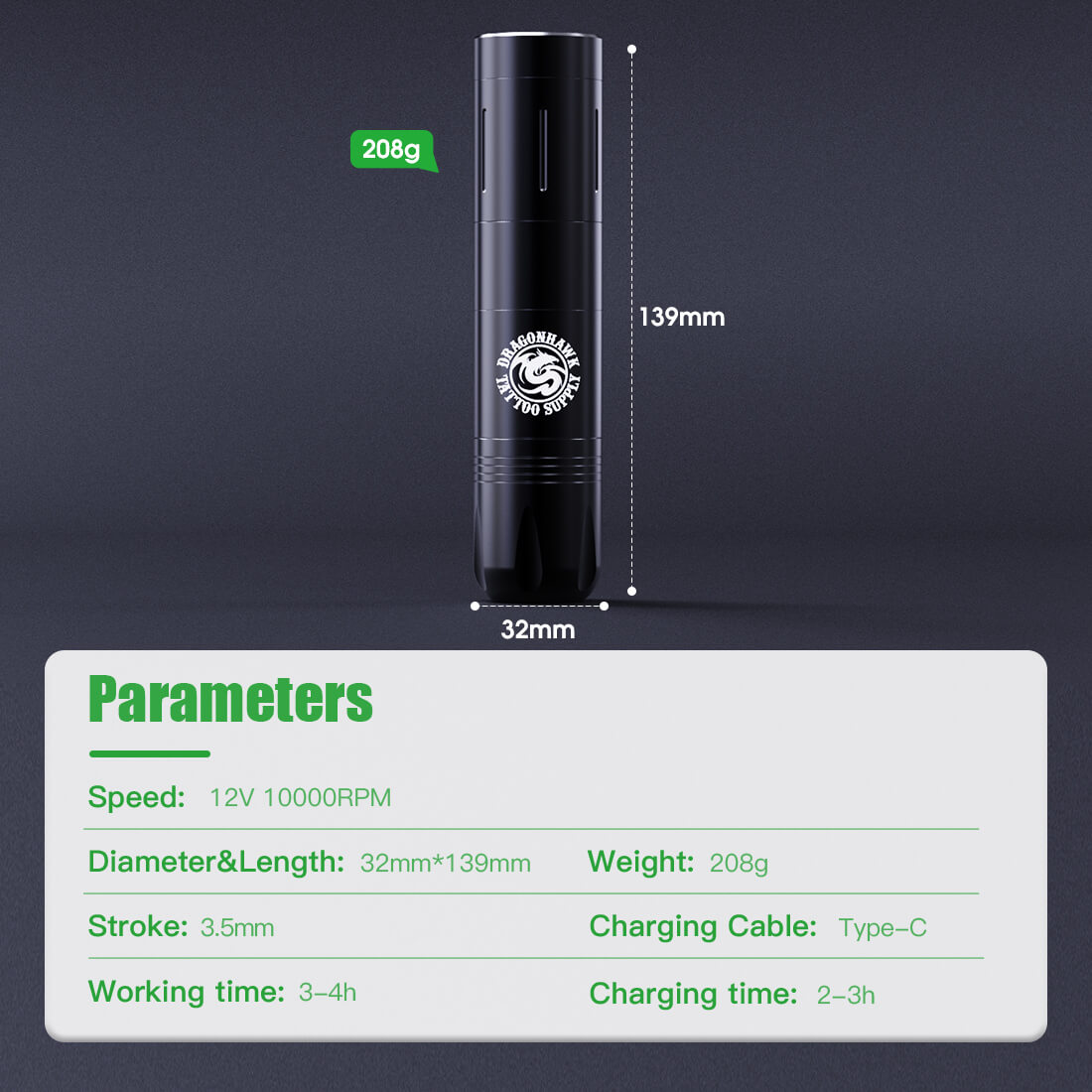 - Ручка для татуювань Dragonhawk Бездротова перезаряджувана ручка для татуювань Ротаційна машинка для татуювання з моторним пістолетом РК-дисплей із зарядним пристроєм із 2 акумуляторів для початківців.