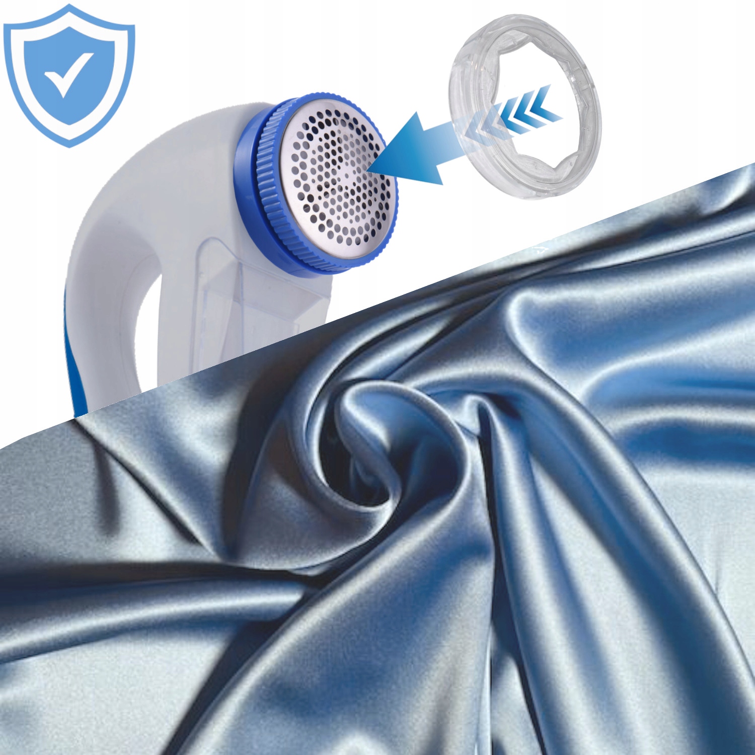 У комплект входить спеціальний захисний чохол для тканини, які можна наносити на голівку для гоління. Ковпачок прозорий і працює, закриваючи товщі отвори в голові та зберігаючи безпечну відстань між тканиною та головою.