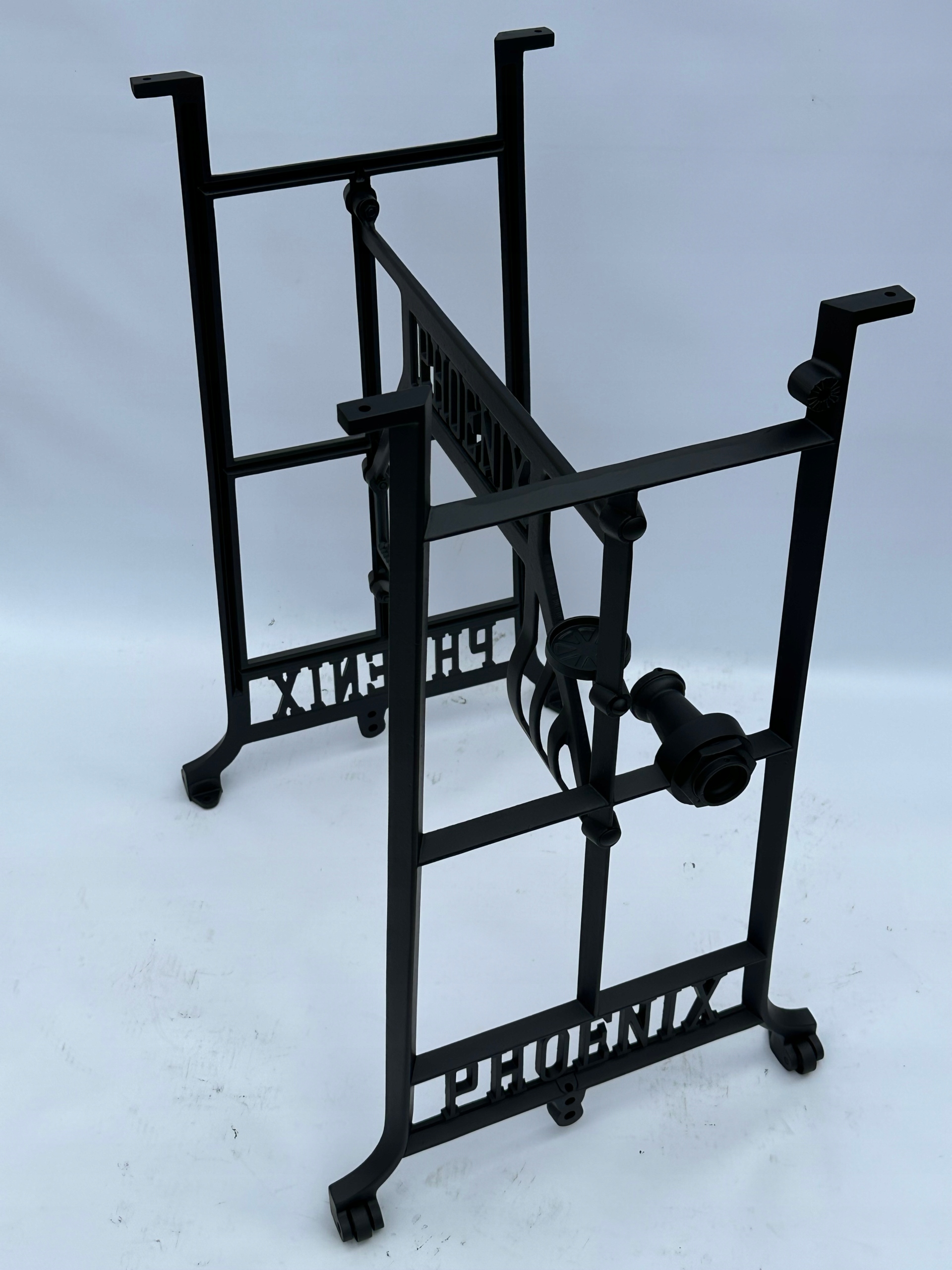 Предмет продажу стара чавунна основа від швейної машинки ФЕНІКС. Дуже гарний візерунок. З боків і посередині є написи з логотипом компанії. Він має всі 4 колеса в нижній частині.