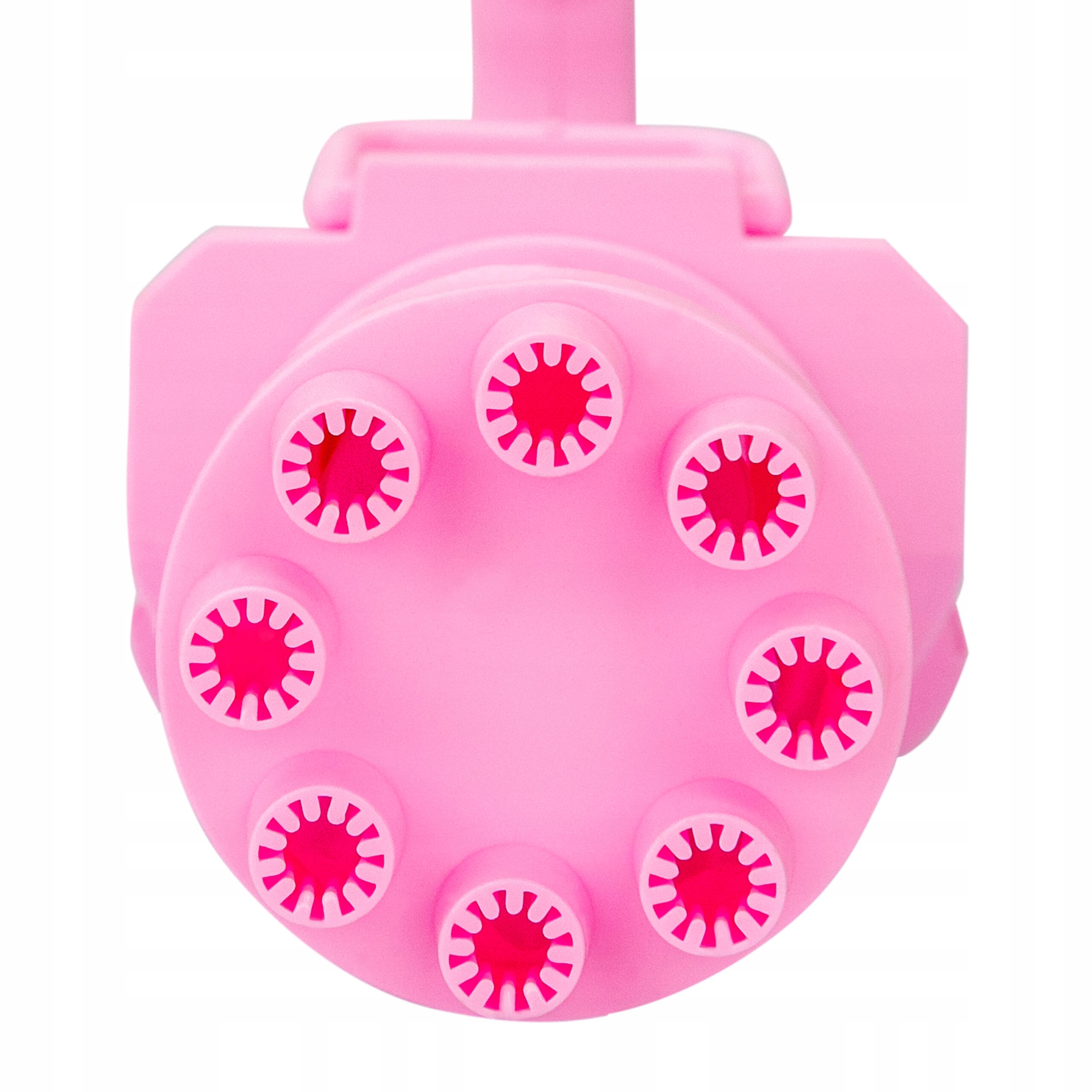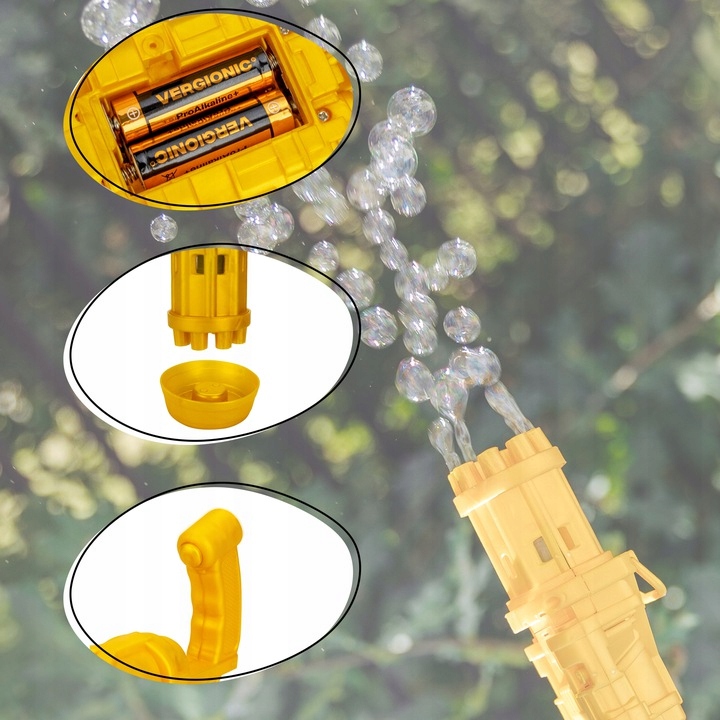 пістолет для випуску бульбашок вибирати три кольори - золото, чорний та рожевий. Це дозволяє звільнити величезну кількість бульбашок відразу, завдяки 8 великих отворів , не маючи напруження і дути. Пістолет працює від батарейних батарей 3 AA (не включається). Для своєї роботи просто просочіть отвори в ємності з рідиною і натисніть кнопку запуску. Після зняття кришки бульбашками пістолет можна використовувати як вентилятор для охолодження.