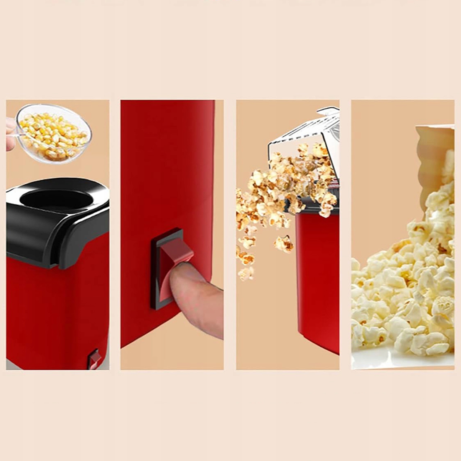 🍿 використовує електричну систему гарячого повітря для делікатного, нежирного препарату, в якій кукурудзяні зерна нагріваються теплим повітрям, що спричиняє, що вони стрибають і готові до споживання протягом 2-3 хвилин.