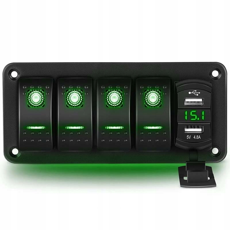 Панель управління, комутатор з розетками Voltmeter та USB. Він має 4 вимикачі. Ідеально підходить для каравану, будинку або яхти. Колір підсвічування зеленого світлодіода