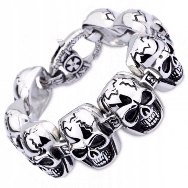 Ми пропонуємо вам елегантний браслет, повністю виготовлений із високоякісної хірургічної сталі 316L, яку часто називають ювелірною, нержавіючої або благородною сталлю. Виріб збагачено мотивом черепа, поверхня якого ідеально відполірована, з високим глянцем і глянцевим покриттям. Зображення черепів виглядає дуже реалістично завдяки виїмкам і виступам. Браслет був створений з особливою увагою до деталей і неймовірною точністю для максимального комфорту його використання. Він неодмінно припаде до смаку навіть вимогливим одержувачам і стане чудовим і вдалим подарунком.