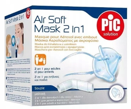 Маска Air Soft 2in1 для поршневих інгаляторів. Ергономічна форма, легко адаптується до обличчя і дозволяє правильно проводити терапію дитини та дорослої людини. Поряд з мундштуком він забезпечує високу ефективність інгаляції. обличчя. . Підключена система дозволяє наблизити потік до рота, безпосередньо перенесуючи туманний розчин до нижніх дихальних шляхів, тим самим уникаючи природної дії фільтрації носа та оптимізації терапії. Продукт