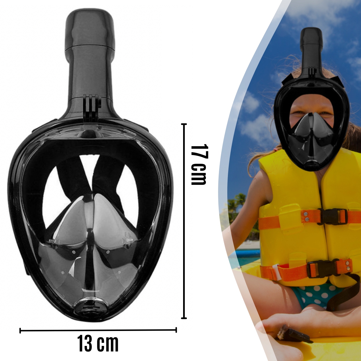 Поверхня маски створена для забезпечення кута огляду 180 градусів. Крім того, маска не тисне на обличчя, а її міцна система кріплення та регульовані широкі лямки гарантують, що вона не впаде навіть під час стрибка у воду.