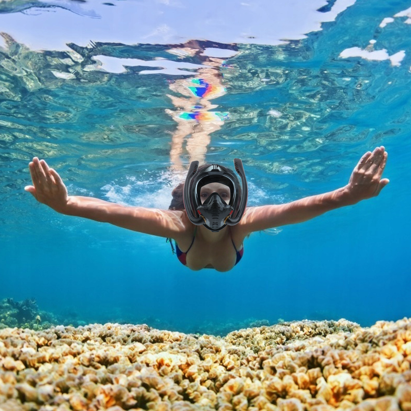 Якщо ви любите снорклінг, ви не можете пропустити наш набір масок для снорклінгу. Виготовлений з ABS, PC і силікону, він є високоякісним і міцним. Подвійні захисні трубки для дихання під водою. Ви заслуговуєте на один комплект.