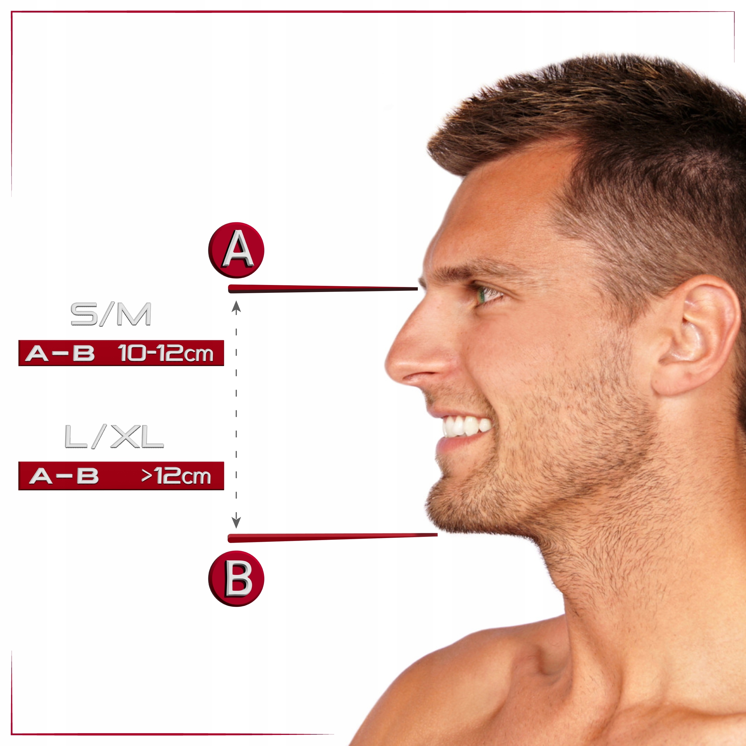 ➡️ Ми рекомендуємо виміряти ваше обличчя, щоб переконатися, що маска підходить. Виміряйте відстань від підборіддя до верхньої частини носа - відповідно до інструкцій на фото.