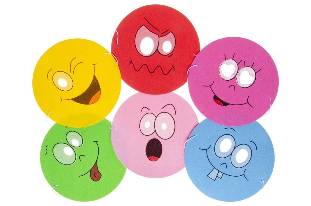 4 Перетворюючи вас на жвавий смайлик, ви станете зіркою вечірки. Маски кладуть на еластичну смугу і мають дві дірки для очей, що забезпечує комфортну форму. Вони також пристосовані до обличчя дитини, тому наймолодший може насолоджуватися грою улюбленого смайлика. Вони доступні в 6 різних конструкціях, які ми продаємо як суміш. Тепер кожна дитина може вибрати свій улюблений смайлик і справити враження на кожній вечірці. Коротше кажучи,