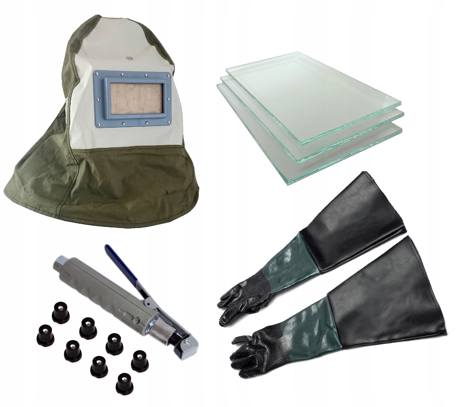 МАСКА ЗАХИСНА З ПІСКОСТРУЙНИМ ШОЛОМОМ + 3 СКЛА + РУКАВИЧКИ + СИФОННИЙ ПІСТОЛЕТ З 8 НАСАДКАМИ