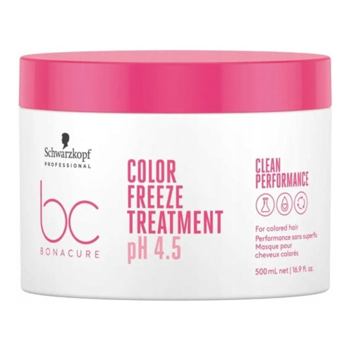 Schwarzkopf Bonacure Color Freeze - це маска, призначена для фарбованого, освітленого та хімічно обробленого волосся. Крім того, маска має живильні властивості, зменшує кучерявість і розгладжує волосся. 100% веганська композиція, збагачена веганським гідролізованим кератином, який міститься у відкритих кутикулах волосся. Маска має кислий рН 4,5, завдяки вмісту молочної кислоти та гідроксиду кальцію ущільнює та стабілізує матрицю волосся, довше зберігаючи колір та захищаючи його від вицвітання. Він перешкоджає вимиванню кольору, таким чином подовжуючи стійкість фарбування.