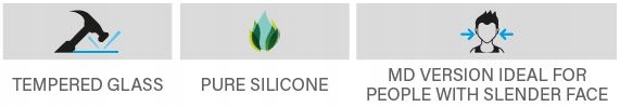 4 фартух від м'якого силікону. скло загартовано. полегшення коригування ремінця. виріз силікон біля основи носа полегшує ручку і, таким чином, вирівнює тиск при зануренні.