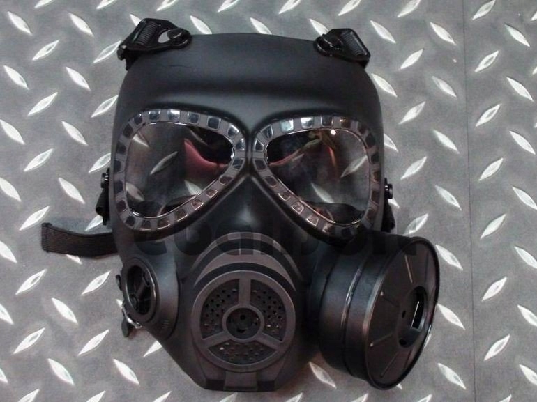 Повна захисна маска Toxic MASK з працюючим вентилятором у «повітряному фільтрі» для запобігання запотіванню окулярів. Чудове ігрове обладнання типу ASG. Вентилятор працює від двох батарейок АА (не входять в комплект). Розмір регулюється за допомогою лямок. Маска виготовлена з якісного пластику (АБС), тому повністю захищає обличчя. Маска також має вентиляційні отвори. Очні отвори закриті товстим полікарбонатним склом (але без сертифіката, рекомендовано використання додаткових стекол).