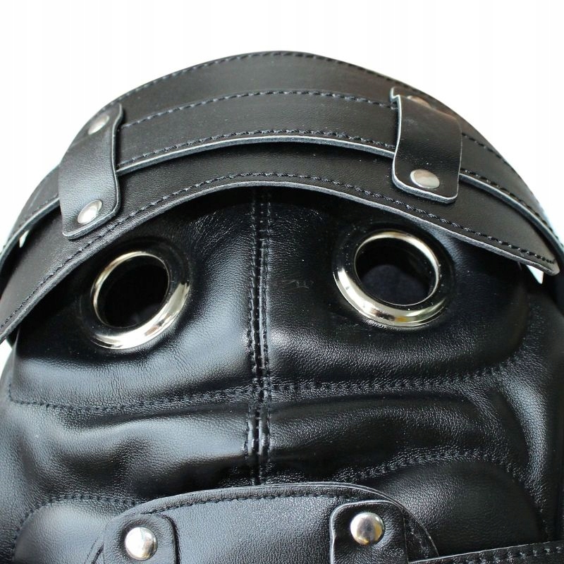 Маска зашнуровується ззаду та застібається ременями на замок.