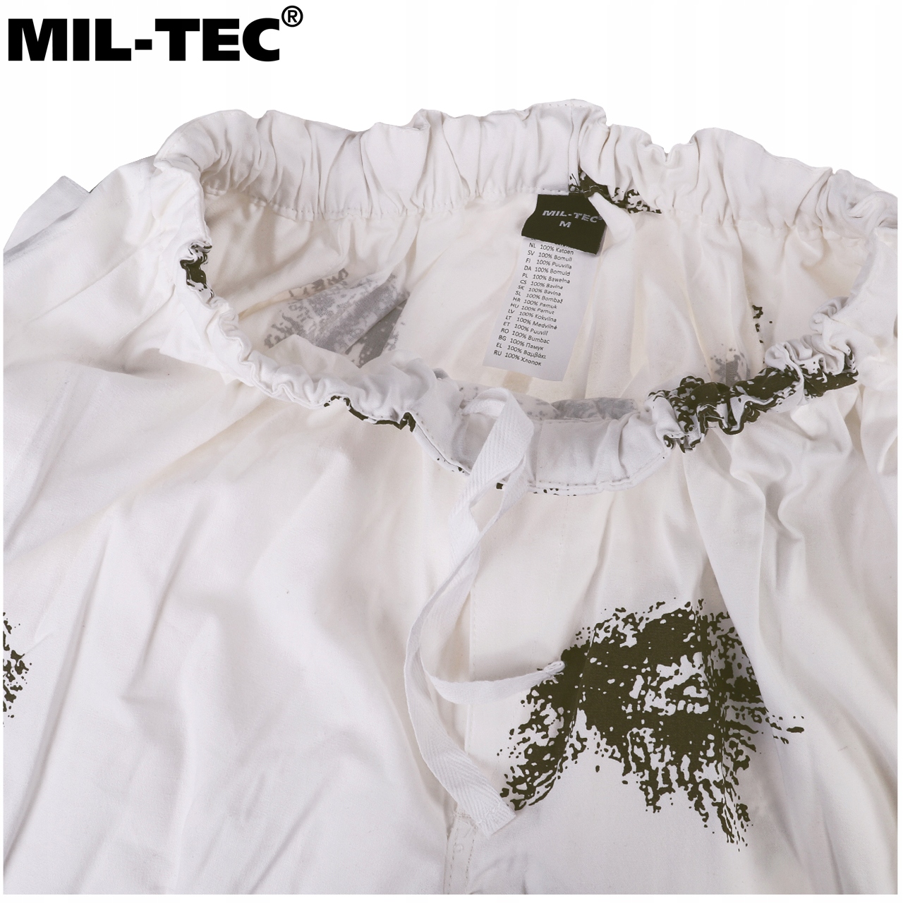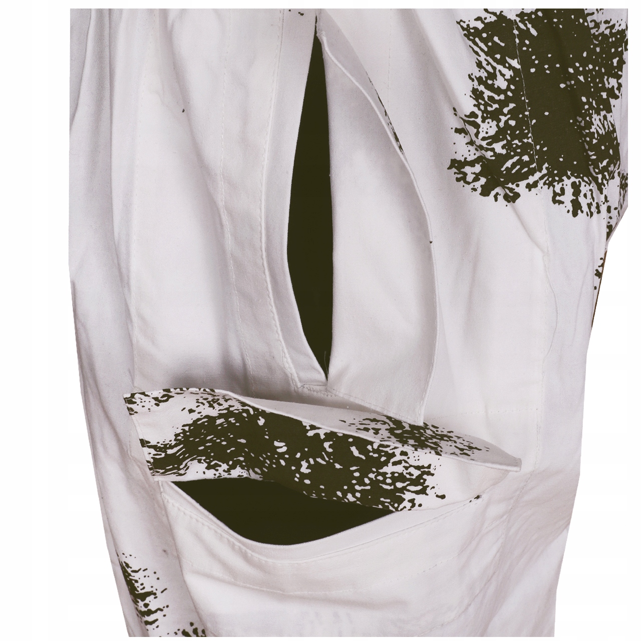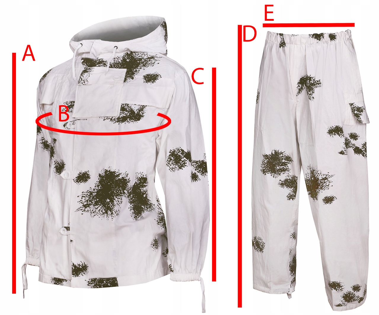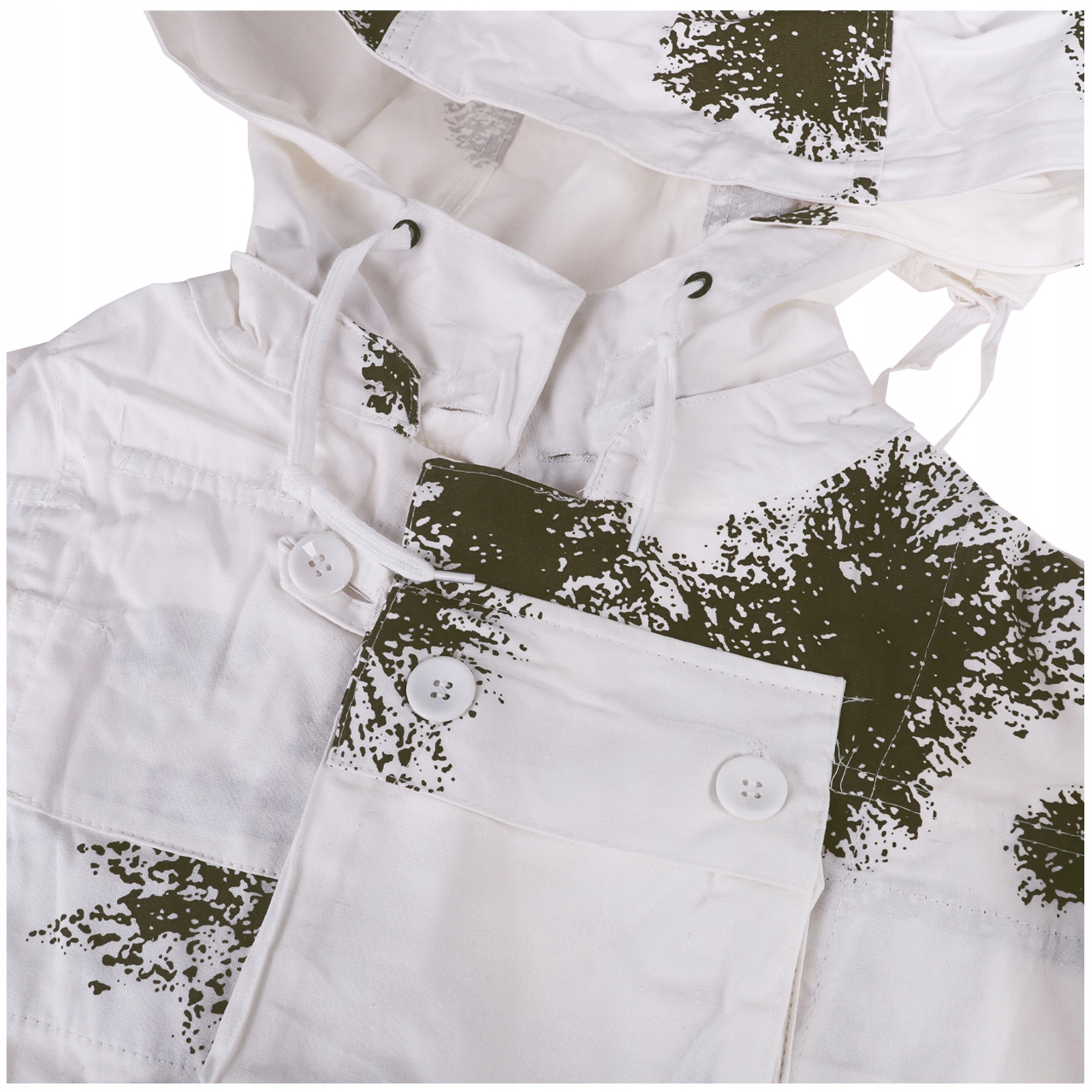 Виготовлений з міцної бавовняної тканини. Біле забарвлення і плями, що нагадують хвойні гілки, забезпечують відмінну маскування на відкритій місцевості і в лісі. Комплект складається з толстовки, штанів і капюшона. Вільний крій маскалати забезпечує комфорт і свободу рухів навіть у товстому зимовому одязі, а також додатково маскує, розмиваючи форму силуету.