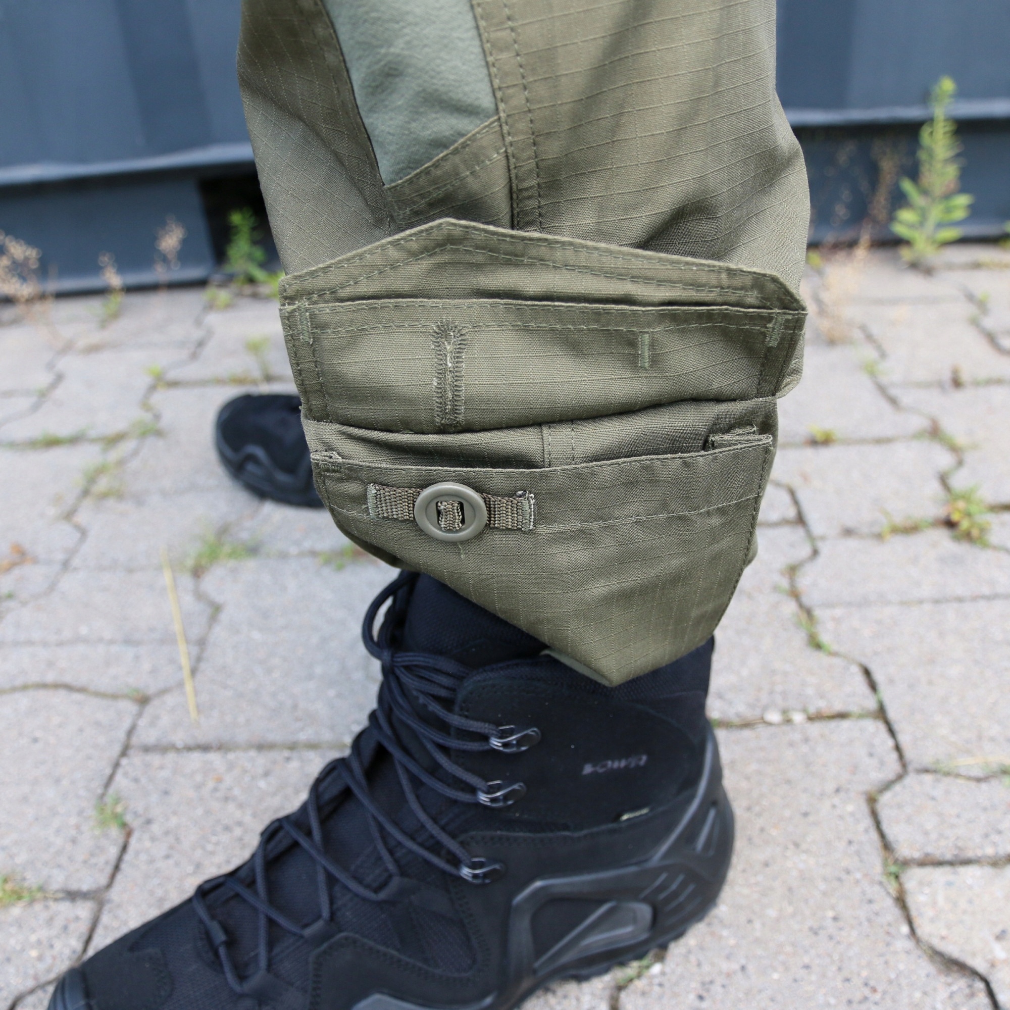 Новий розріз штанів у Ranger Green , з додатковими вставками для розтяжок у чутливі місця (коліна, крок і ремінь у задній частині). У кишенях стегнової кістки підйомник, що дозволяє регулювати висоту коліна. Штани мають загалом до 12 функціональних кишень.