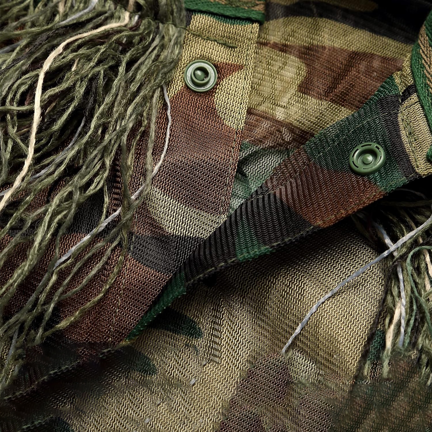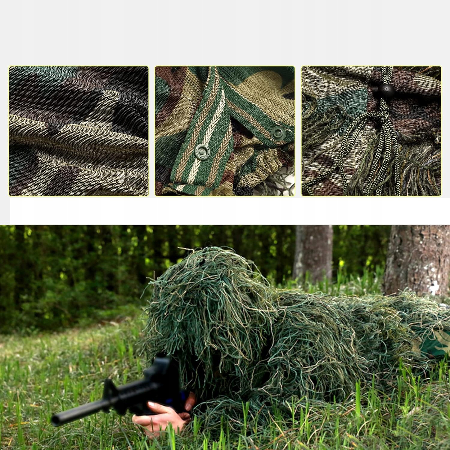 - Костюм ghillie виготовлено зі зручної поліпропіленової та поліефірної тканини з додатковим вдосконаленим 3D-камуфляжним візерунком та концепцією імітації трави. Мисливський костюм ghillie покритий щільними нитками, що дозволяє краще маскувати та полювати під час страйкболу в дикій природі.