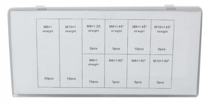Набір масленок, необхідних для правильного функціонування механізми, робота яких базується на довгостроковій експлуатації підшипників, які потребують додаткового змащування для належного функціонування. Різьба нарізана в метричній системі. Комбінація з 9 розмірів, упакованих у зручний органайзер.