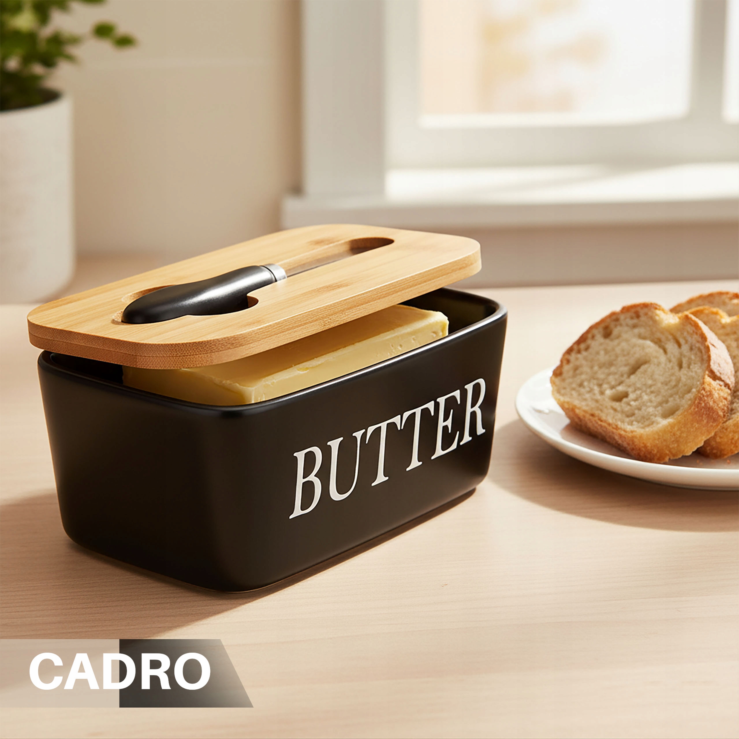 Елегантність і свіжість на вашому столі! Ця сучасна маслянка поєднує функціональність із модним дизайном. Виготовлена ​​з чорної кераміки і покрита бамбуковою кришкою, маслянка ідеально вписується в сучасний інтер'єр. Ключовою перевагою є силіконовий ущільнювач, який забезпечує свіжість масла, і ніж у комплекті, який знаходиться в кришці.
