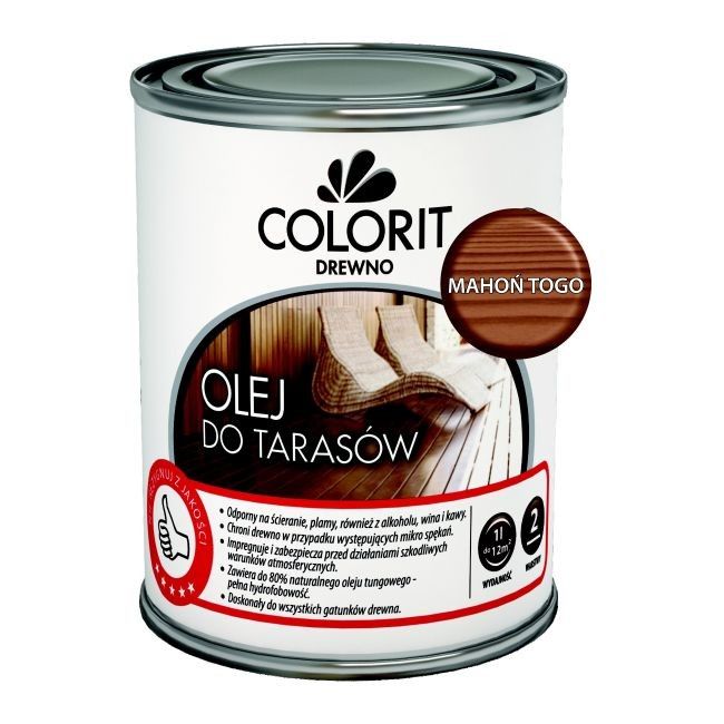 Олія для тераси Colorit гармонійно адаптована до колірних відтінків і властивостей багатьох порід благородної деревини, в тому числі і екзотичної. Поверхню, покриту маслом, легко доглядати та ремонтувати.