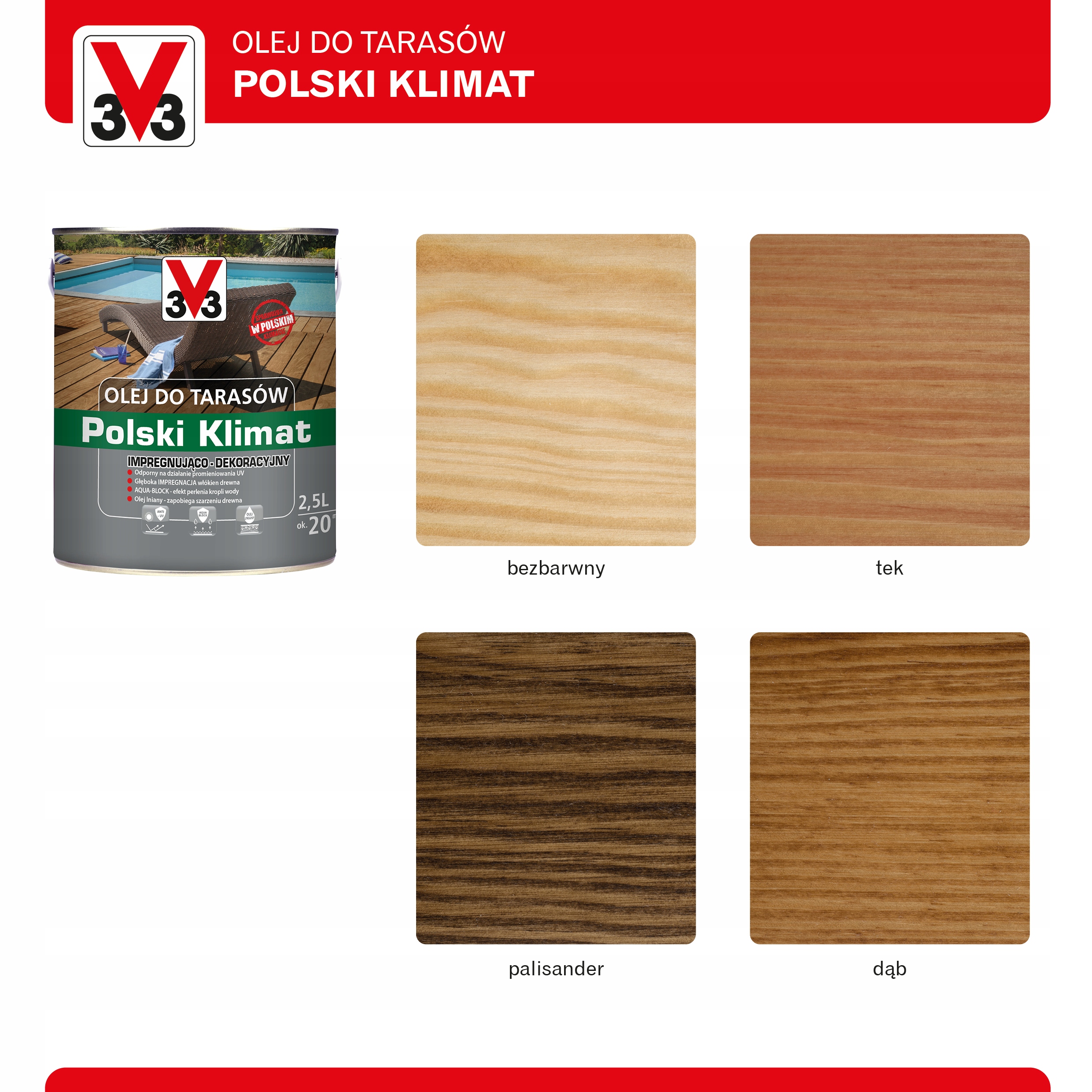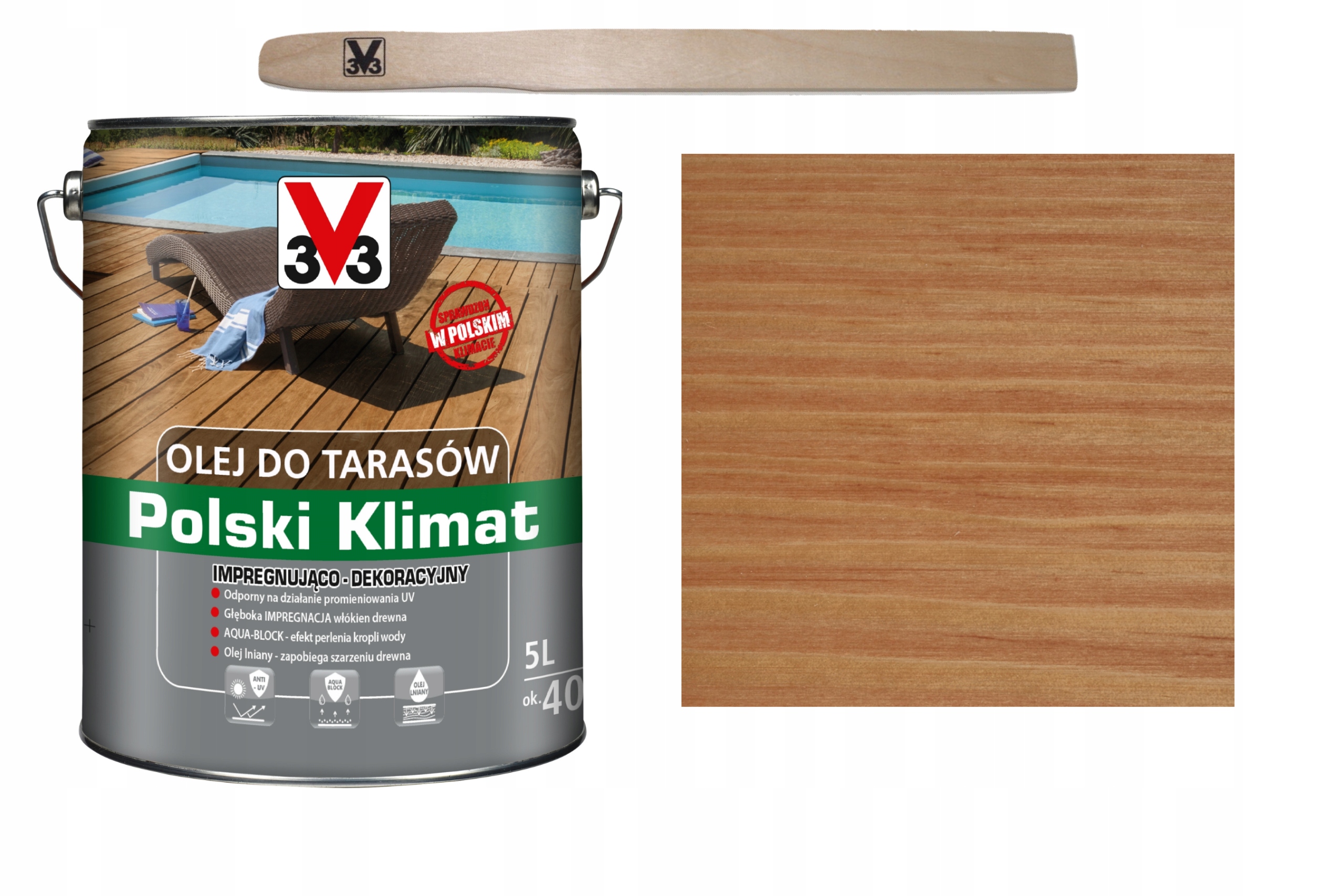 Польська терасова олія Klimat V33 — це продукт на основі натуральної лляної олії з додаванням алкідних смол, який зарекомендував себе в суворому польському кліматі. Глибоко проникає в деревину, захищаючи її від несприятливого впливу погодних умов. Захищає і прикрашає терасові поверхні з домашніх порід, таких як сосна, модрина, ялина, а також тика і екзотичної деревини. Його також можна використовувати для деревини, просоченої тиском.