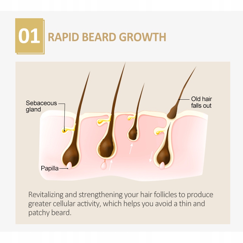 Ця олія для бороди збагачена багатьма природними поживними речовинами, які проникають до коренів волосяних фолікулів, відновлюють і активують сплячі волосяні фолікули, поглинають поживні речовини та прискорюють ріст волосся.Захист волосяних фолікул. Створення здорового середовища для росту волосся.