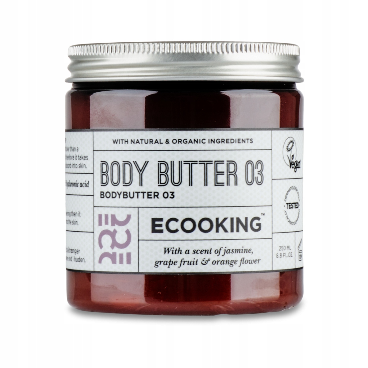 Насичений веганський крем для тіла Ecooking, наповнений сумішшю зволожуючих і пом’якшуючих шкіру олій і живильного масла какао. Хоча крем має насичену консистенцію, він не жирний і швидко вбирається.