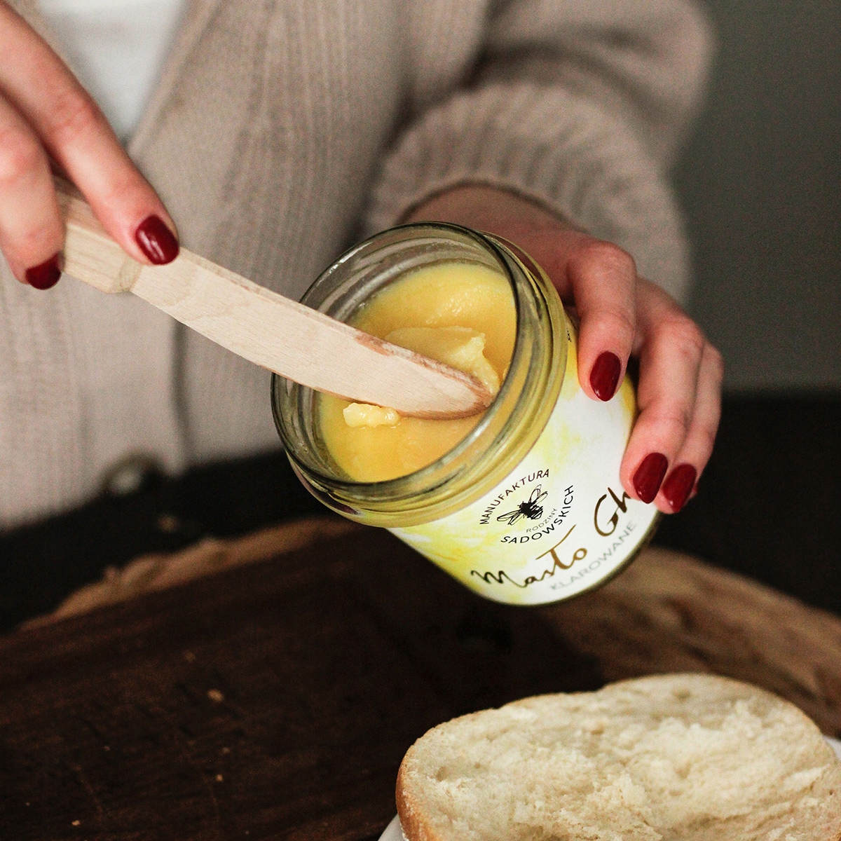 Освітлене вершкове масло виготовляється традиційно протягом 8-12 годин у повільному процесі за індійським рецептом. З молока польських корів, що паслися на бещадських пасовищах. Освітлене вершкове масло ідеально підходить для смаження - воно має високу температуру димлення 260 градусів Цельсія. Чи може бути краще?