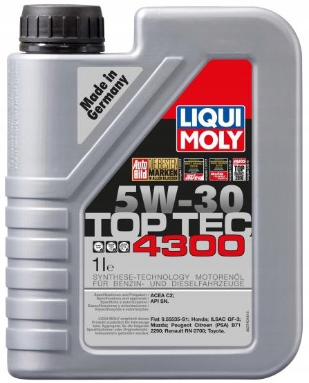 Top Tec 4300 5W-30 Це сучасна, малозольна, легка проточна олива зі зниженою в'язкістю для цілорічного використання. Комбінація нетрадиційної масляної основи на основі синтетичної технології в поєднанні з новітніми присадками гарантує відмінний захист від зносу, зниження витрати палива і масла, а також швидкий доступ масла до всіх змащуваних елементів під час запуску оснащений сажовим фільтром. Максимальний інтервал заміни цього масла становить до 40 000 км, в залежності від рекомендацій виробника автомобіля. Це масло також ідеально підходить для легкових автомобілів, що працюють на газі CNG/LPG. Застосування: Оптимально для сучасних бензинових і дизельних двигунів з технологією наддуву. Особливо підходить для транспортних засобів, які відповідають стандарту EURO IV, тобто автомобілів, обладнаних сажовим фільтром (DPF/FAP).