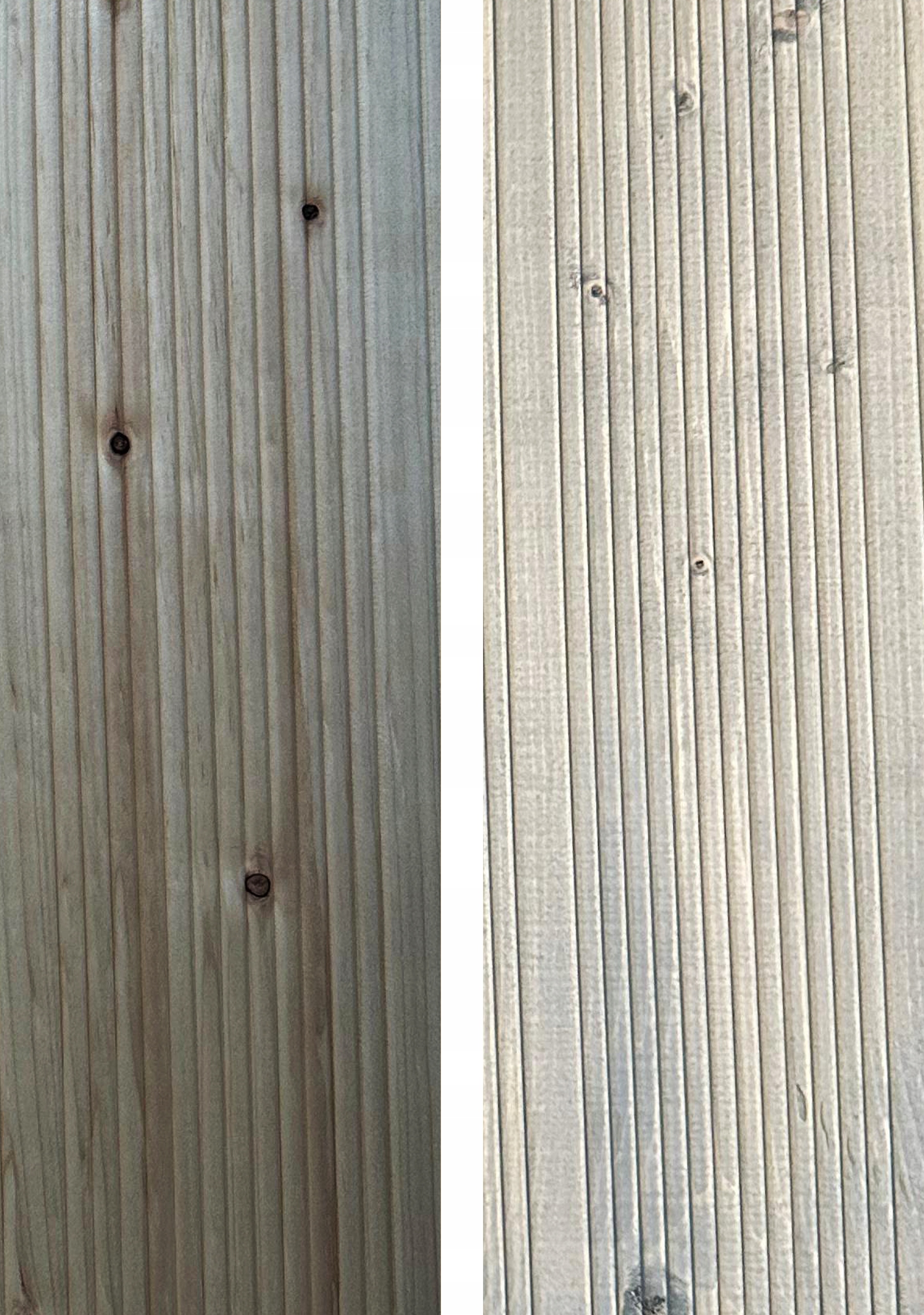 Нижче наведено ефект «до» і «після», фарбування виконано двічі на деревині ялини.