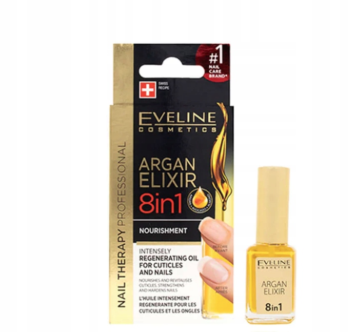 Інтенсивна розкішна регенерація нігтів та шкури за допомогою арганової олії. Argan Elixir 8W1 - це концентрований продукт - швидко поглинаюча композиція з унікальним поєднанням чистої арганової олії, авокадо та мигдальної олії - вона була розроблена для інтенсивної регенерації нігтів і шкурів. Він забезпечує оптимальну допомогу сухої, пошкодженої шкіри навколо нігтів і слабких, крихких нігтів. Після використання нігті залишаються гладкими, стійкими до пошкоджень і блискучих. Суха і розтріскана шкіра стає гладкою і м’якою.