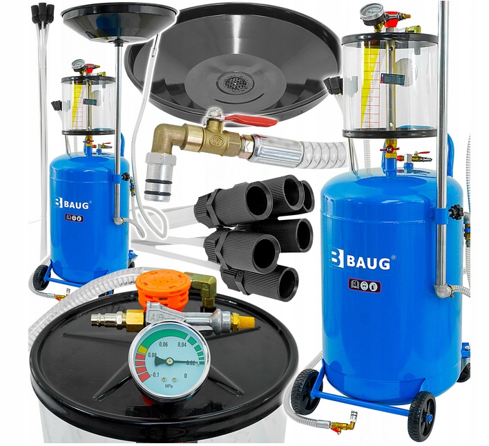 Пневматична мийно-відсмоктувальна машина BAUG — професійний пристрій, який використовується для гравітаційного зливу відпрацьованого масла з двигунів, коробок передач і диференціалів усіх типів транспортних засобів. Поєднує в собі функції мийки та маслозмінного пристрою. Ідеально підходить для заміни масла - дозволяє як заливати, так і висмоктувати мастило зсередини двигуна. Завдяки додатковим наконечникам і всмоктуючим щупам заміна масла буде швидкою і безпроблемною. Разом з пилососом ви отримаєте набір з п'яти всмоктувальних шлангів, які значно полегшать вашу роботу. Чотири гнучкі і дві металеві всмоктувальні труби виготовлені з високоякісних матеріалів, що забезпечує ідеальну герметичність і відмінну пропускну здатність. Подивіться, як просто користуватися цим пристроєм. Зручні коліщатка та практична ручка дозволяють легко переміщати цей пристрій у будь-яке місце майстерні, а функція самозливу робить видалення масла легким та чистим.