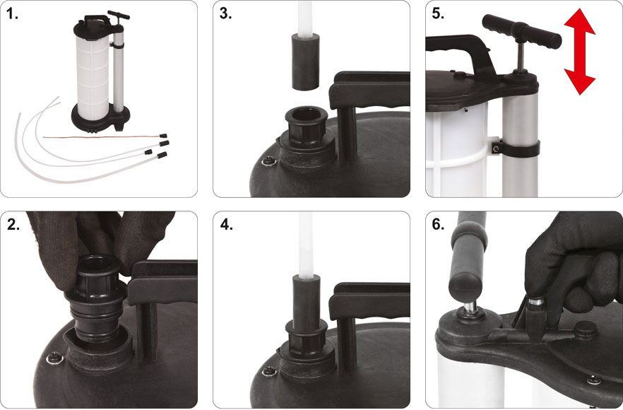 Легка портативна витяжка з ручним механізмом. Призначений для відсмоктування масла або інших робочих рідин із зовнішніх резервуарів або резервуарів машин і пристроїв. Рекомендовано для вантажівок, сільськогосподарських машин, генераторів тощо.