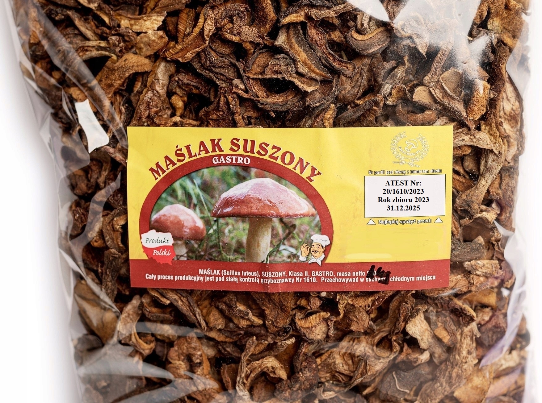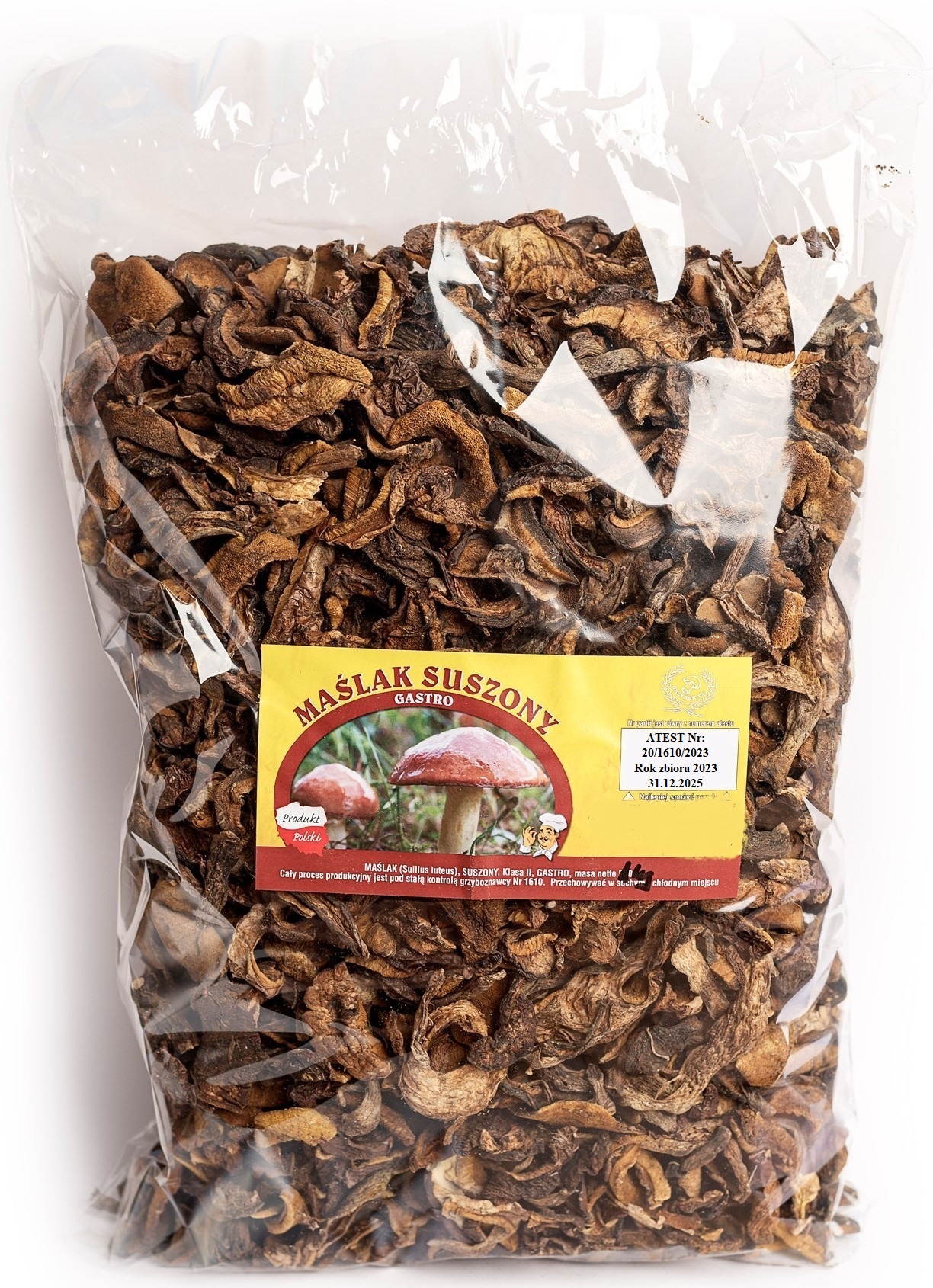 ЕТИКЕТКА ПРОДУКТУ містить СЕРТИФІКАТ разом із номером грибника та підтвердженим роком збору врожаю.