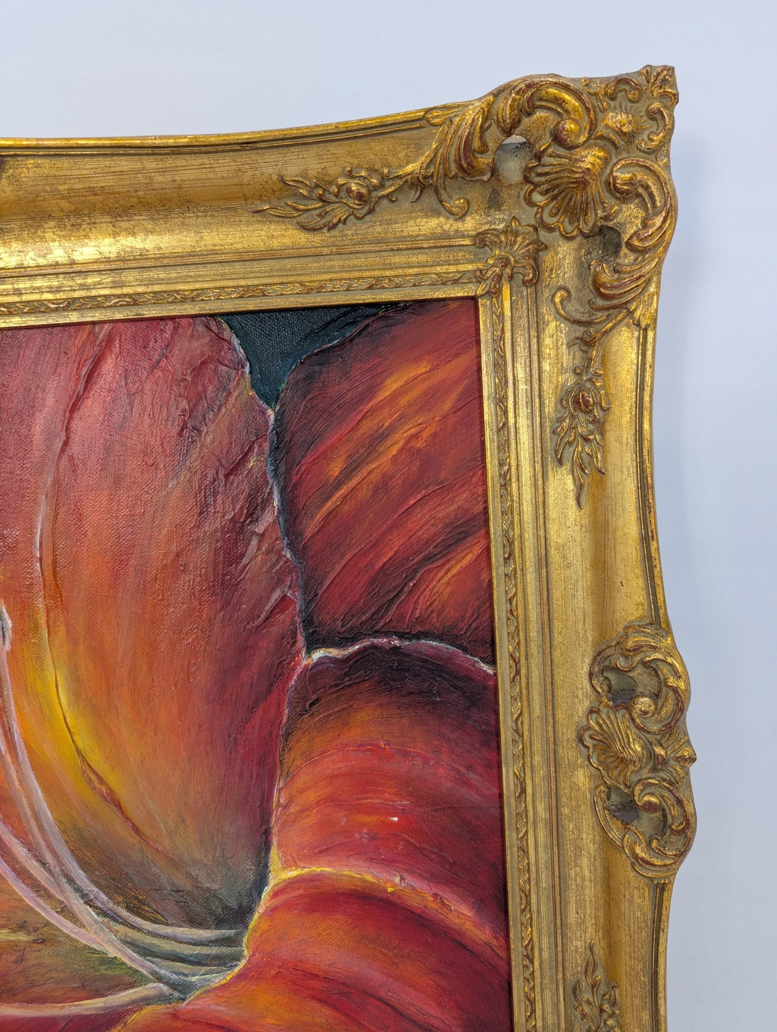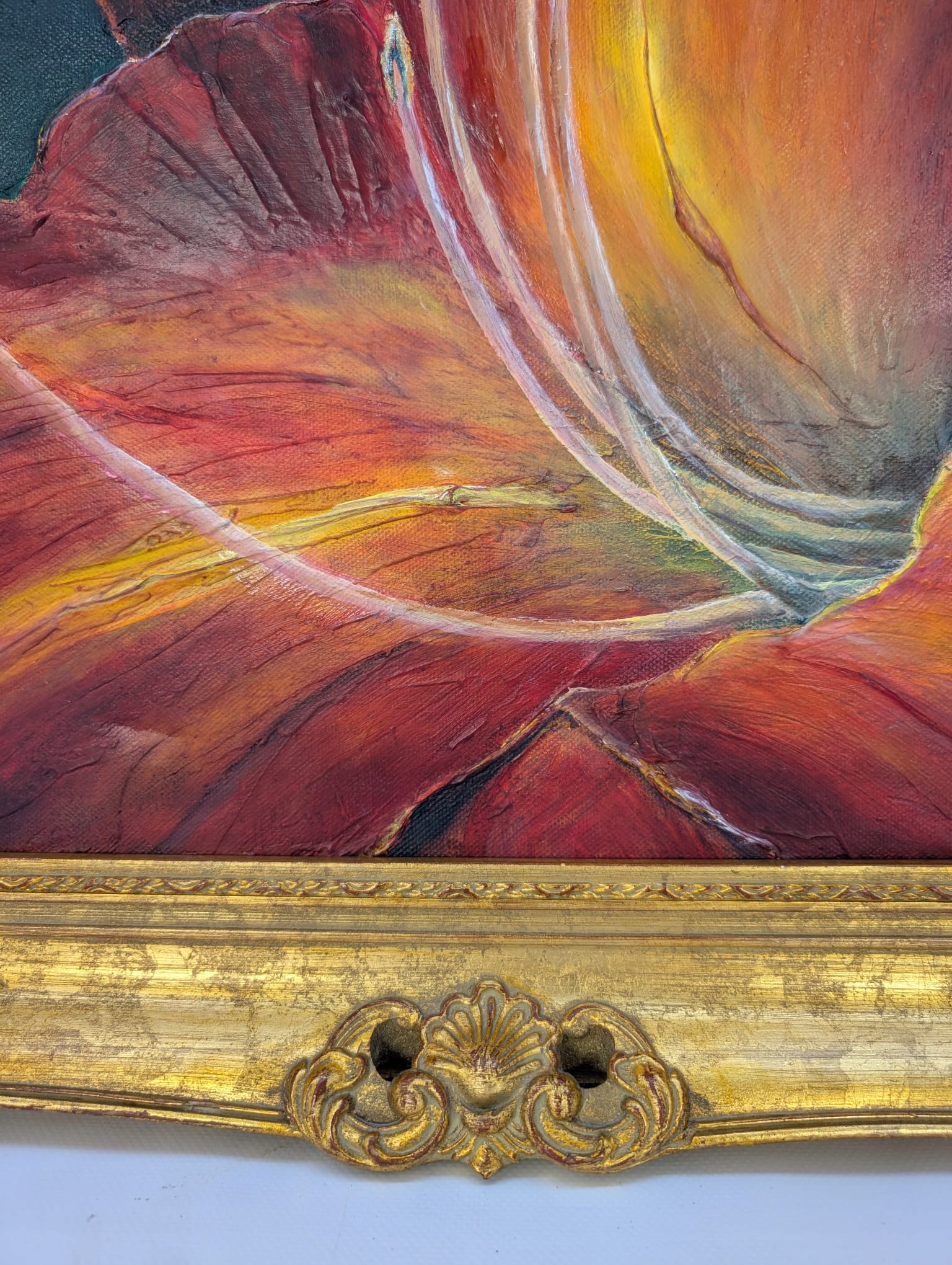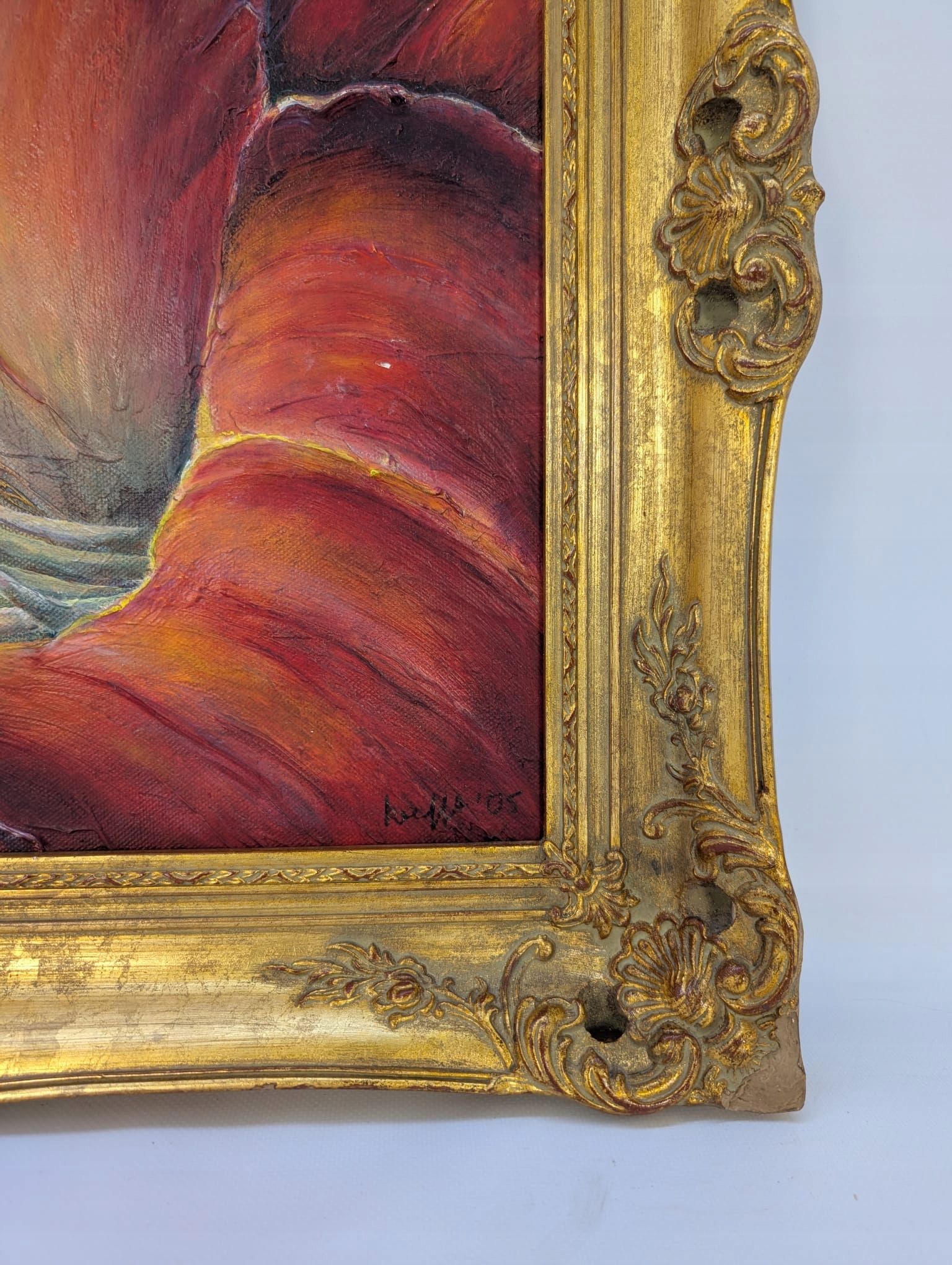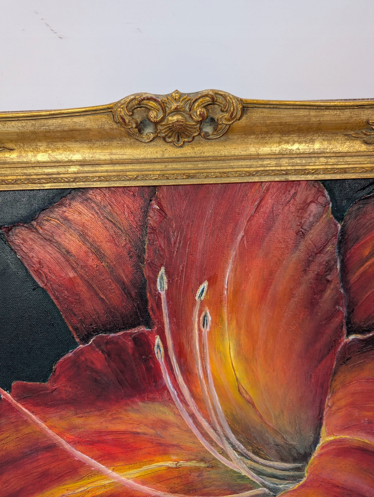 Картина із зображенням квітки ЛІЛІ, написана на полотні в техніці олії в позолоченій дерев’яній рамі з гарним декором.