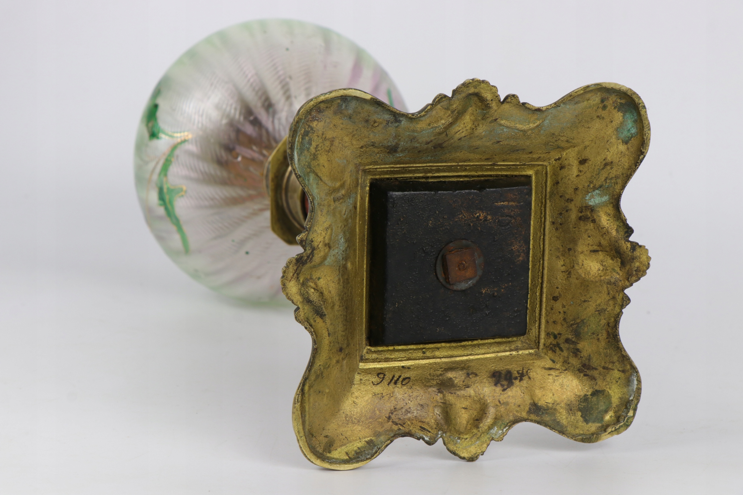 Масляна лампа в стилі модерн. Бронзова основа, на якій кріпиться мармурова шпилька. Резервуар зроблений з дуже цікавого литого скла, покритого емалевими фарбами. Скляна поверхня з характерною ребристою структурою. Скло має злегка зеленуватий відтінок.
