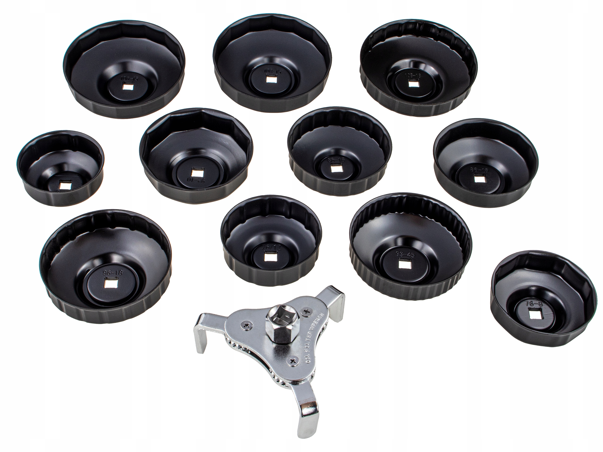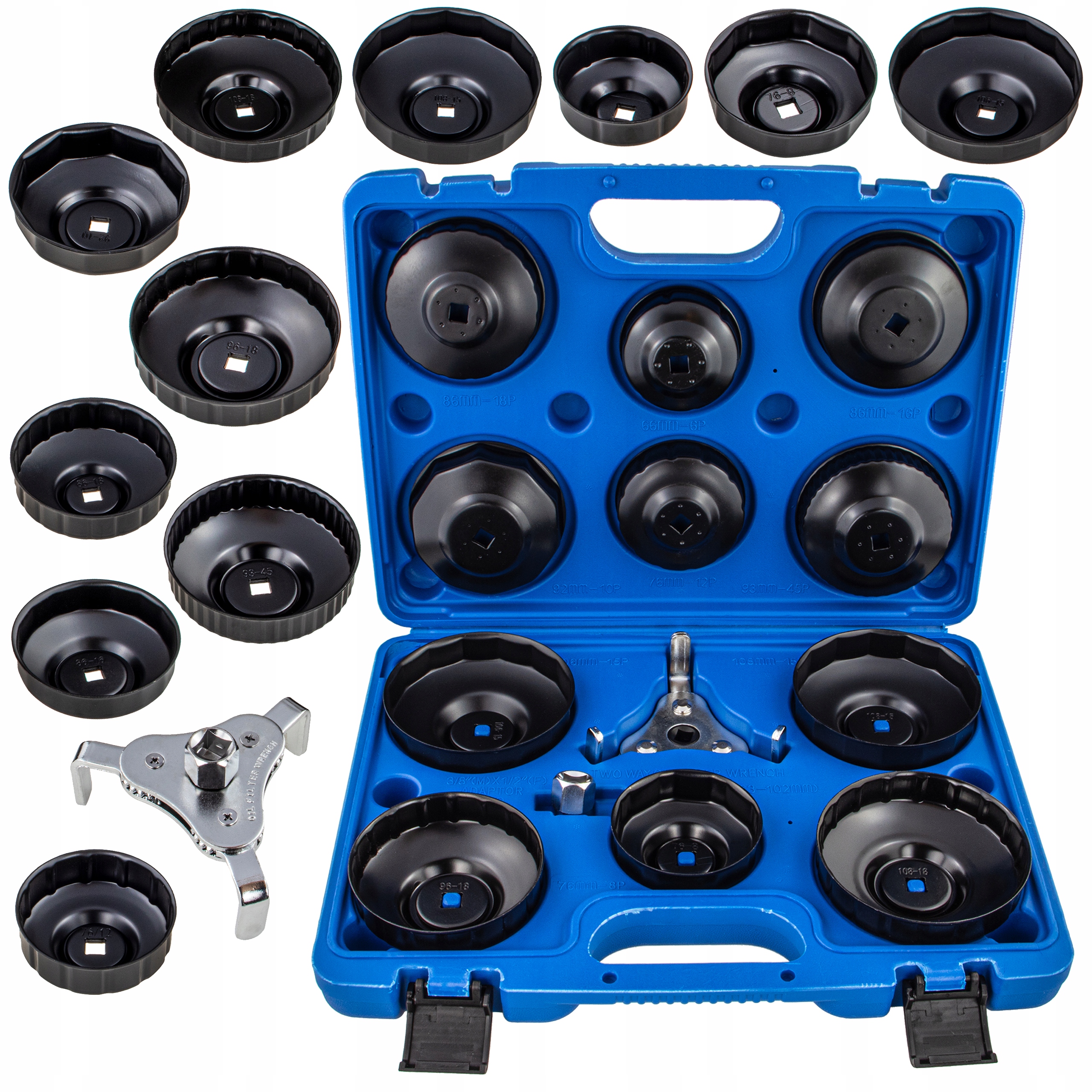 Ключі запасів для нафтових фільтрів. Набір можна використовувати в більшості пасажирських автомобілів, вироблених на світовому ринку. Виготовлений з високоякісних матеріалів, упакованих у тверду пластикову валізу. 108 мм, 106 мм