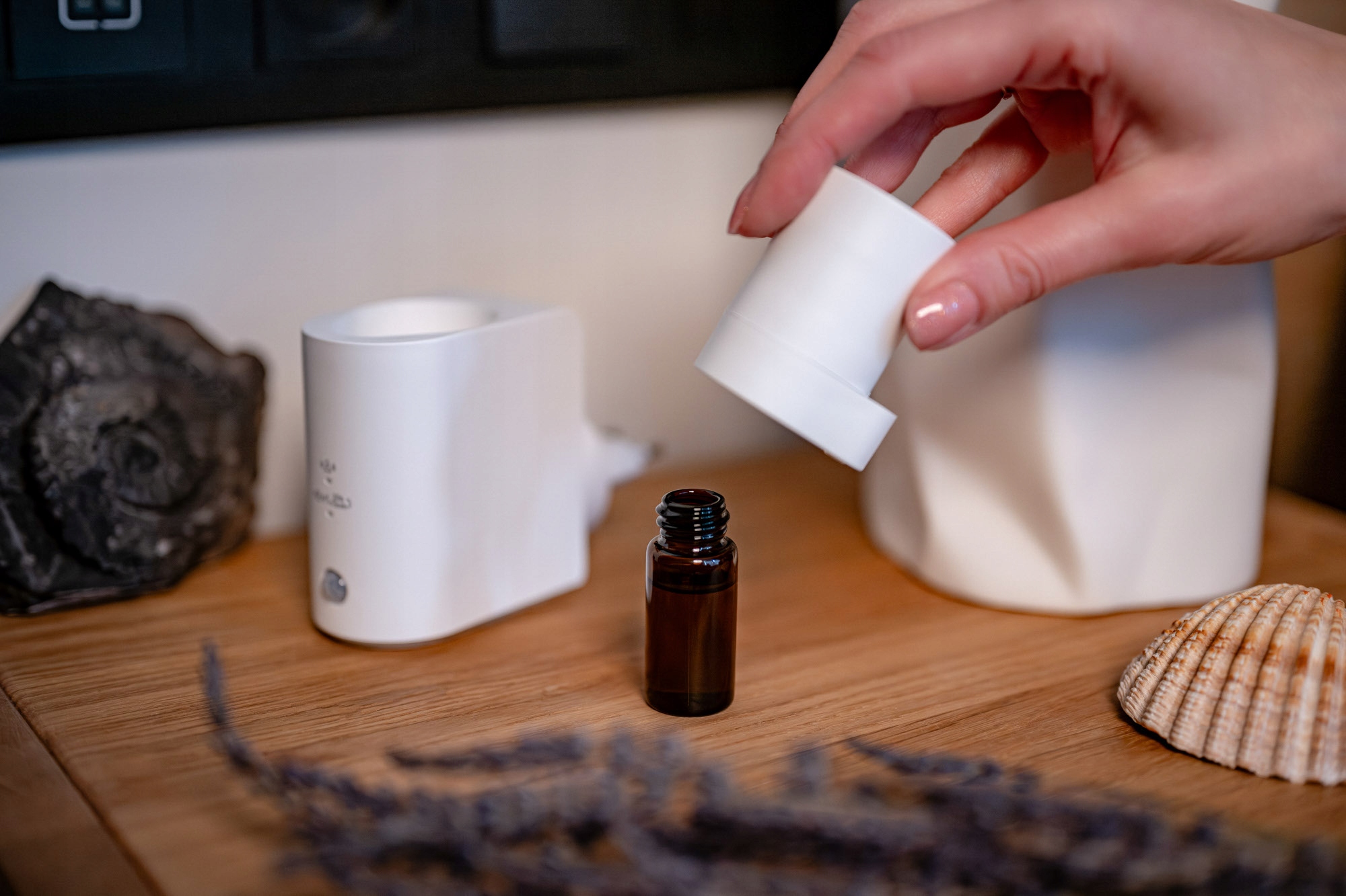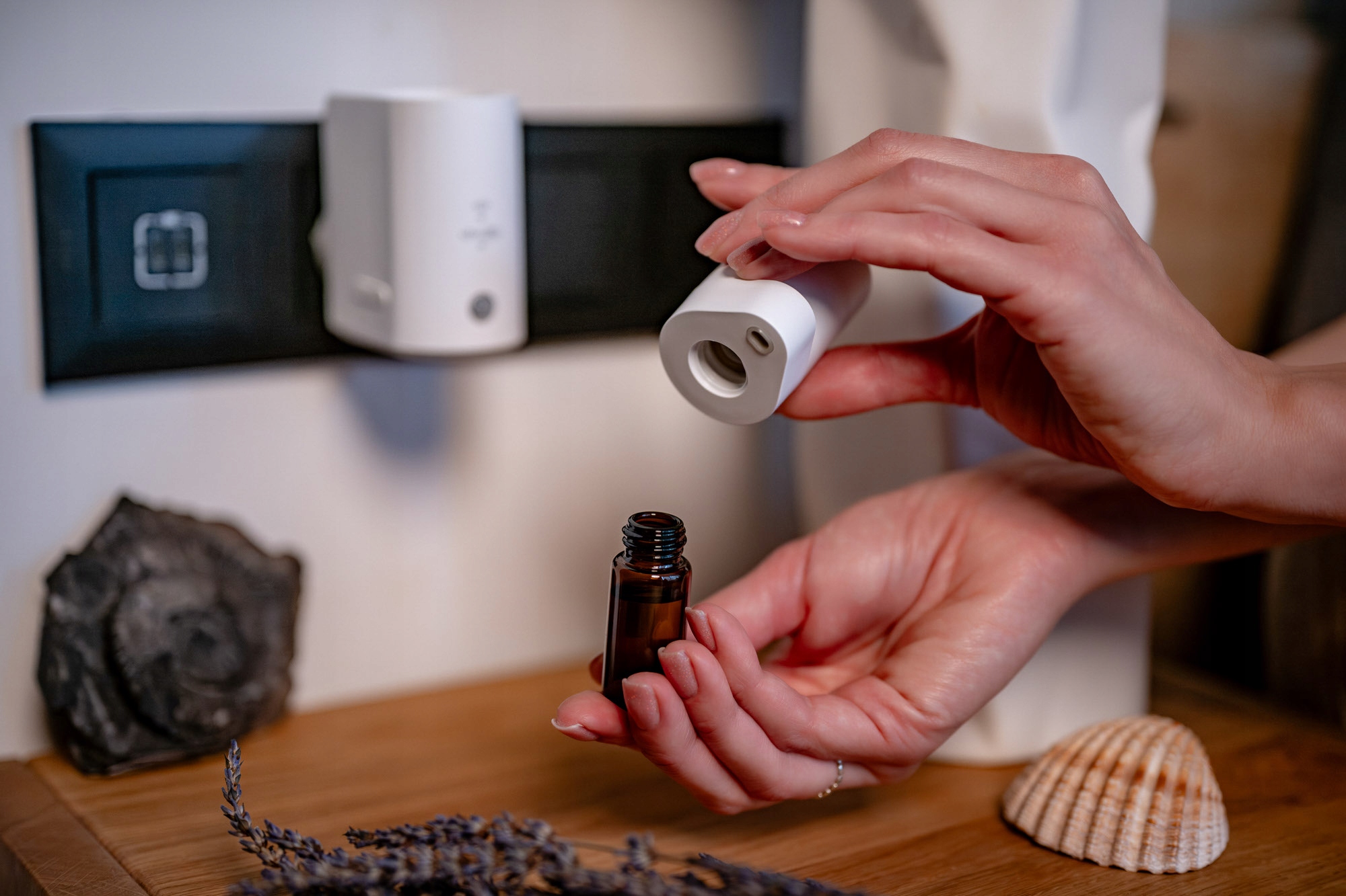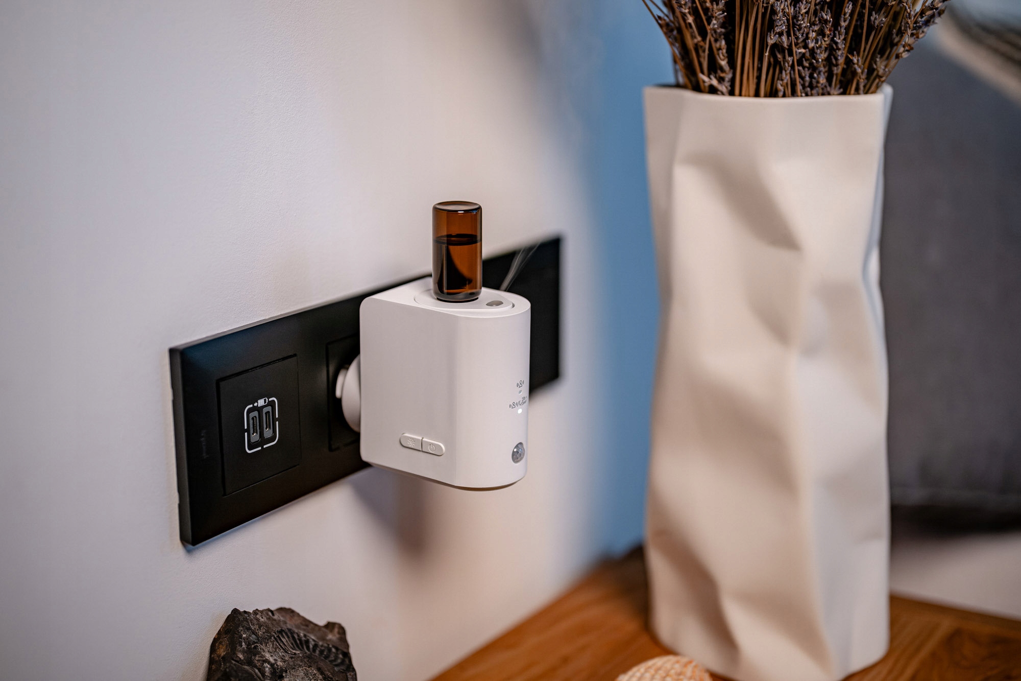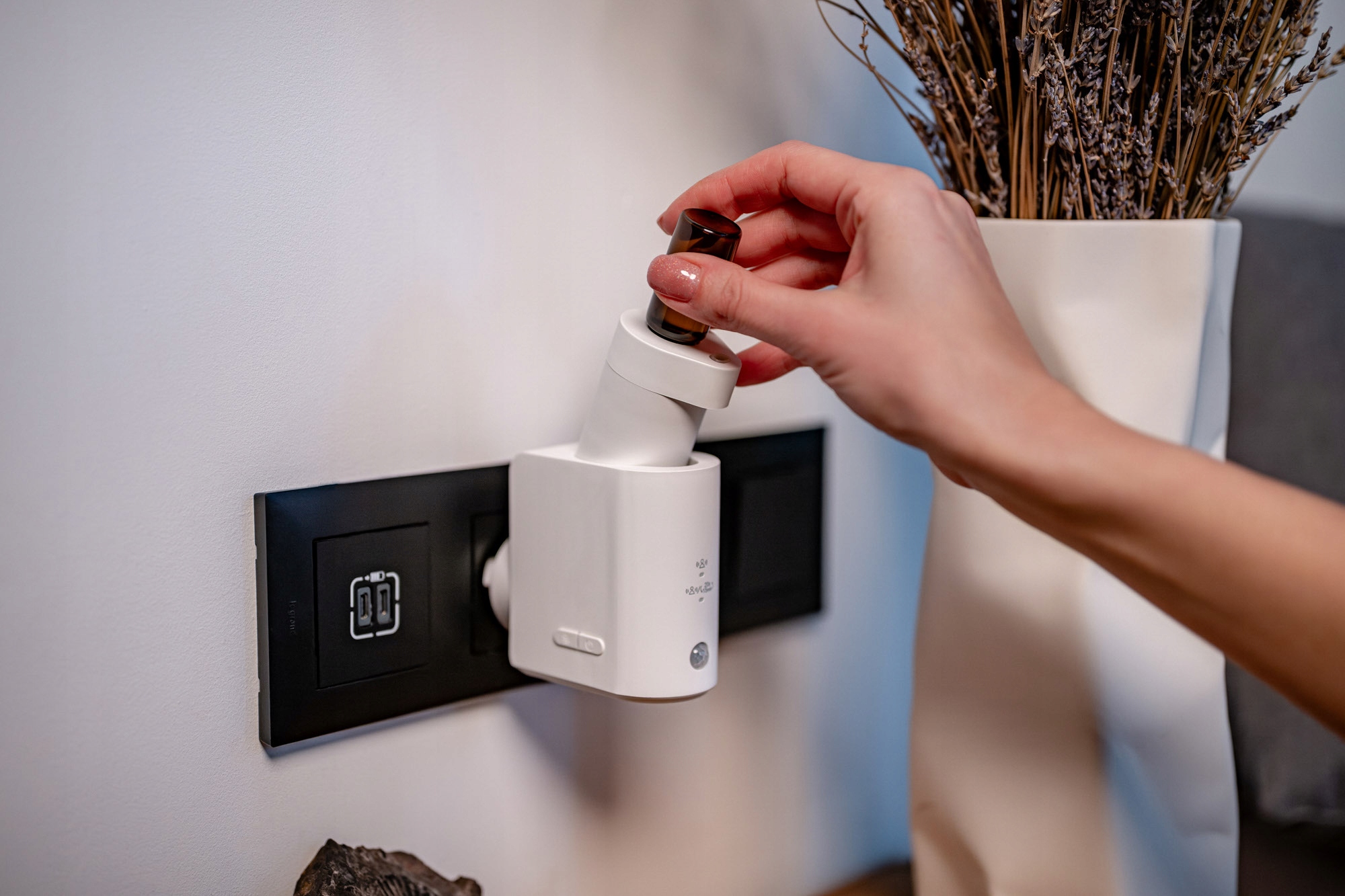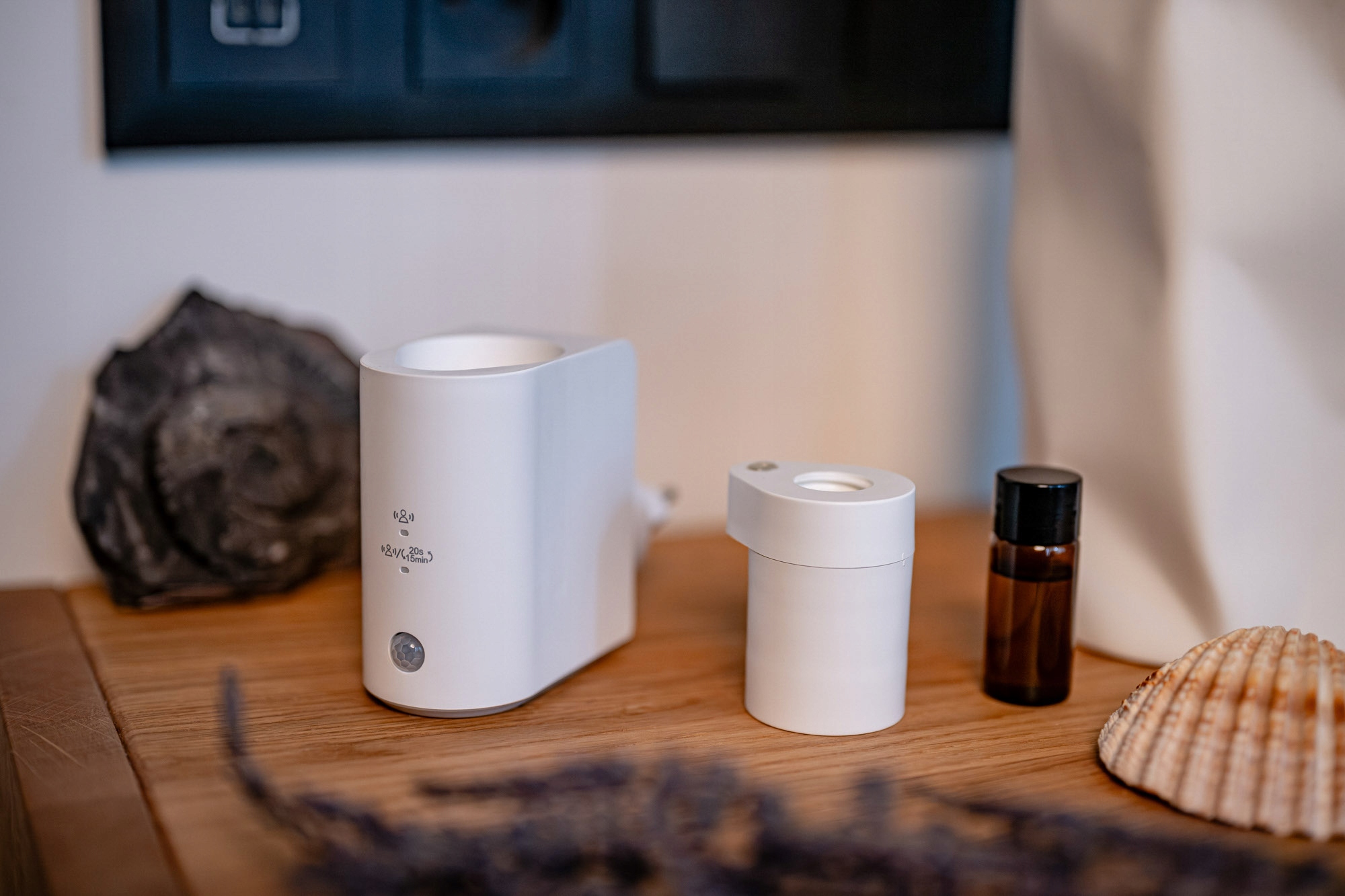 це сучасний ароматизатор ароматизатора, який поєднує чисту, нерозбавлену дифузію олії з інтелектуальним датчиком руху. Пристрій підключається безпосередньо до розетки, тому займає мінімум місця. Humanas Home Spirit працює з найпопулярнішими скляними пляшками ефірних масел. Вони вкручуються безпосередньо в корпус - без додаткових баків і без додавання води. Дифузор пропонує два режими роботи - він може реагувати тільки на рух або автоматично розпорошувати аромат незалежно від нього. Він також може переходити в режим очікування, коли кімната не використовується. Тепле підсвічування додає пристрою елегантності, створює романтичну атмосферу та полегшує орієнтування в темних приміщеннях.