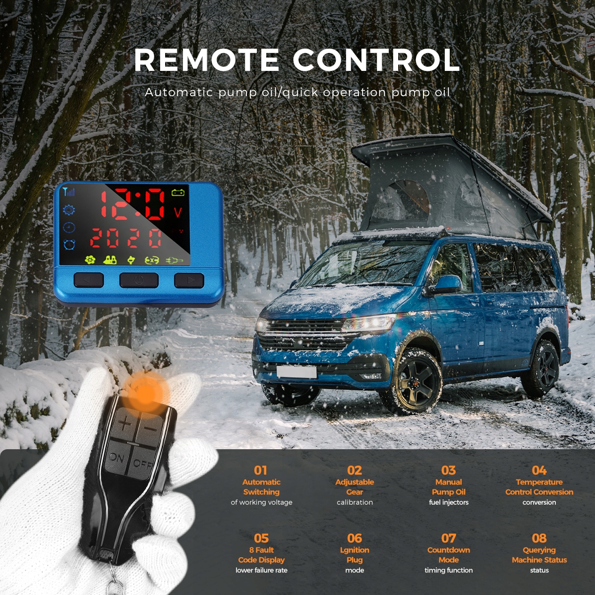 Наша дизельна система паркувального обігрівача оснащена інтелектуальним РК-монітором і пультом дистанційного керування. Після активації таймер і термостат обігрівача можна регулювати автоматично або вручну за допомогою вбудованої РК-панелі. Більше того, температуру можна змінювати за допомогою пульта дистанційного керування, тож ви можете прогріти автомобіль перед тим, як сісти в нього холодним зимовим ранком.