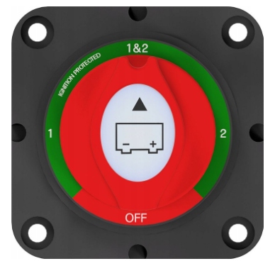 У положенні 1 або 2 Ви можете ввімкнути одну з підключених акумуляторів, у положенні 1 і 2 обидві акумулятори підключені до ланцюга, а вимкнено (червоний) означає вимкнення обох батарей. Коли пристрій або транспортний засіб не використовуються, ви можете використовувати перемикач для розділення з'єднання між акумуляторами, що є безпечним і зменшує споживання енергії.