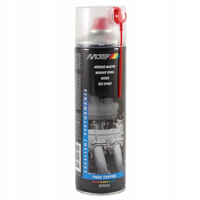 MOTIP 090301 - це високотемпературне, швидковисихаюче мідне мастило. Зменшує тертя металевих частин, запобігає заїданню, скрипу і скрипу. Запобігає зносу та окисленню металевих частин. Захищає гвинти, гайки та підшипники від корозії. Стійкий до води та погодних умов. Покращує герметичність різьбових з'єднань. Мідний спрей має високу термостабільність. Стійкий до температур від -40°C до +1100°C.