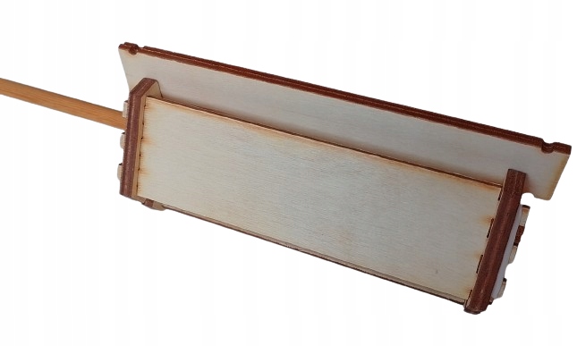 Верстат різається на лазерному плоттері, що забезпечує дуже високу точність і повторюваність елементів. У задній стінці є отвір з «набором» з еластичної гуми, який адаптується до розеток різної ширини. Дротик розміщується між двома пластинами, а потім вставляється в прорізи, розташовані на висоті діаметра радіуса. Після приклеювання дротика переверніть всю машину та приклейте наступний дротик, використовуючи наступний паз. Готову стрілку легко витягнути завдяки вирізам у передній стінці машини.