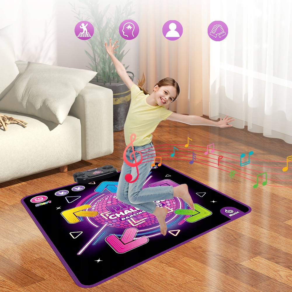 Танцювальний килимок пропонує чотири режими гри: за замовчуванням, гра, виклик та пам'ять. Пориньте себе в цю нову та захоплюючу танцювальну гру для дітей! Слідкуйте за ритмом побудованої музики та танцю до миготливих стріл. Поєднання танцю та музики розвиває рівновагу дитини та покращує його імунітет.