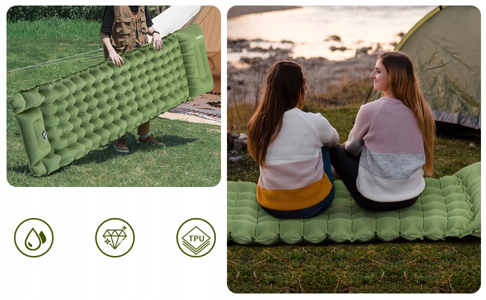 Цей автоматично надувний килимок забезпечує багато місця і оснащений інноваційними подушками безпеки, подушок, що полегшують спину та шию, забезпечуючи максимальний комфорт та тепло під час сну. Кемпінгові матраци забезпечують комфорт навіть на нерівній місцевості та невеликих каменях. Дизайн смуги подушки безпеки та подушки убікіса розроблені для полегшення спини та шиї, забезпечуючи свободу руху та комфорту.