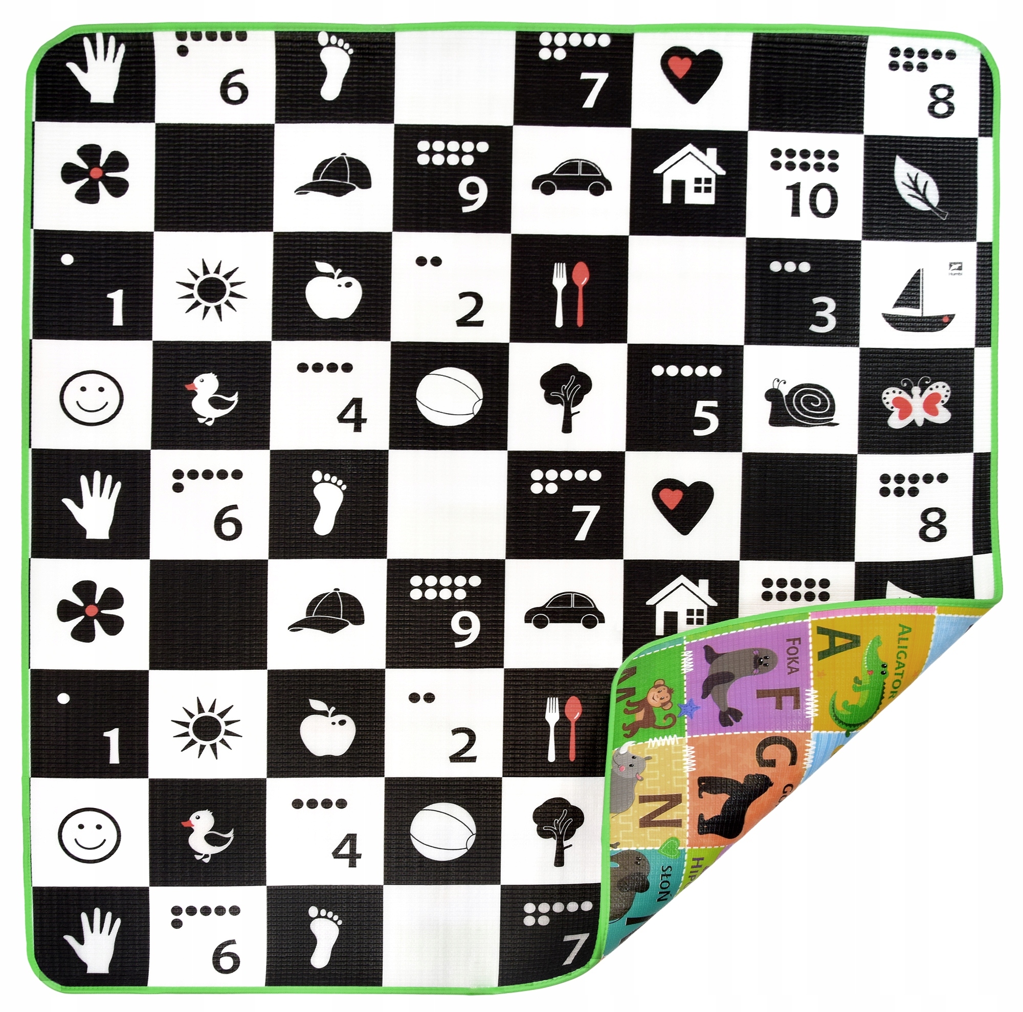 - ЦИФРИ: На більш пізньому етапі навчання для розвитку дитини, килимок сприяє вивченню перших чисел, які знаходяться на контрастній стороні. Біля цифр є крапки, завдяки яким дитині легше зрозуміти поняття кожного числа