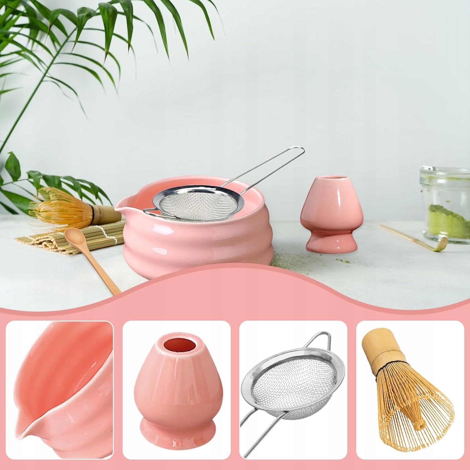 Цей рожевий матч поєднує природну, змащену бамбукову структуру з керамічними елементами класу харчування. Кожна миска на матчу не містить свинцю та кадмію, а бамбук Часен (віскі) - вручну з ретельно відібраним бамбуком, забезпечуючи міцність та безпеку, щоб ви могли насолоджуватися моментом з матчем без страху. Часен (Віскі до Матчі), чайна ложка для матчі, миску для матчі, керамічна основа для чайної ложки та сито для матчі. Набір задовольняє всі потреби процесу підготовки матчів, що робить його простим у використанні як для досвідчених ентузіастів, так і для початківців. Бамбук Часен після використання слід промивати теплою водою і висушити на підставці, що робить легке та практичне обслуговування. Ідеальна підготовка напою, роблячи підготовку матчі справжнім задоволенням - це ключовий елемент набору. Незалежно від того, чи є коханцем чаю, членом сім'ї чи другом, цей приглушений набір аксесуарів до Matcha додасть кольору на кухню, створюючи гармонійну атмосферу - це практичний і гарний подарунок, який демонструє догляд.